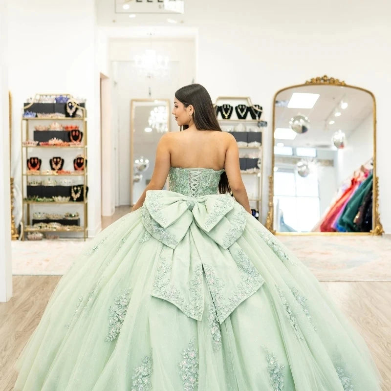 Your Quinceañera is a once-in-a-lifetime event. Make it unforgettable with this breathtaking 3D Flowers Beading Appliques Bow Quinceanera Dress. Trust Quince-Dress to help you create a magical moment that you'll cherish forever.