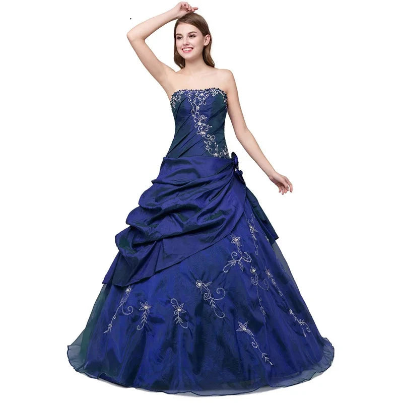 Celebrate in Style: Embrace the magic of your Quinceañera with this gorgeous ball gown. The luxurious fabric and stunning appliqués create a breathtaking ensemble that will captivate everyone. With its lace-up back and flattering pleats, this dress is designed for the girl who wants to celebrate her journey into womanhood with grace and style.
