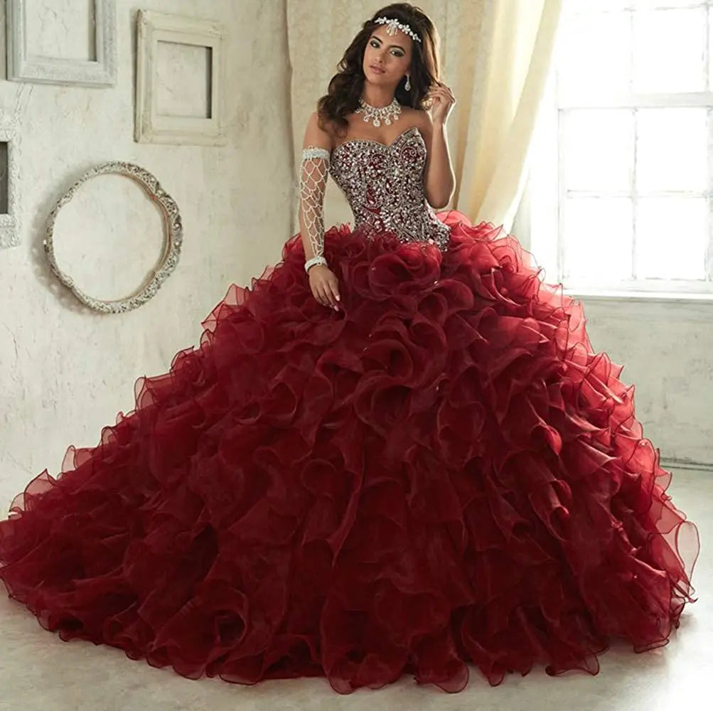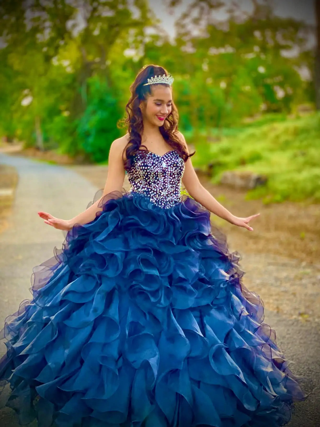 Elegant Beaded Sweetheart Gown: Step into the spotlight with this exquisite heavy beaded sweetheart ball gown. Crafted with luxurious organza and adorned with intricate ruffles, it’s perfect for quinceañeras and sweet sixteen celebrations.