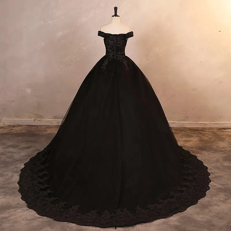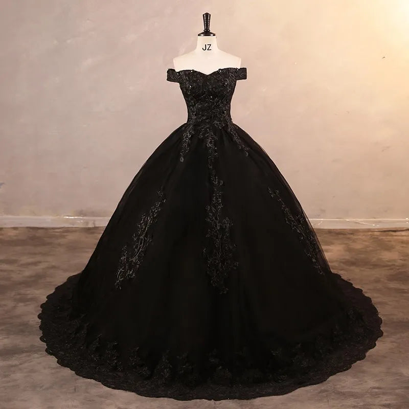 Celebrate your love in unforgettable style with Quince Dress's Elegant Black Off-Shoulder A-Line Wedding Dress.