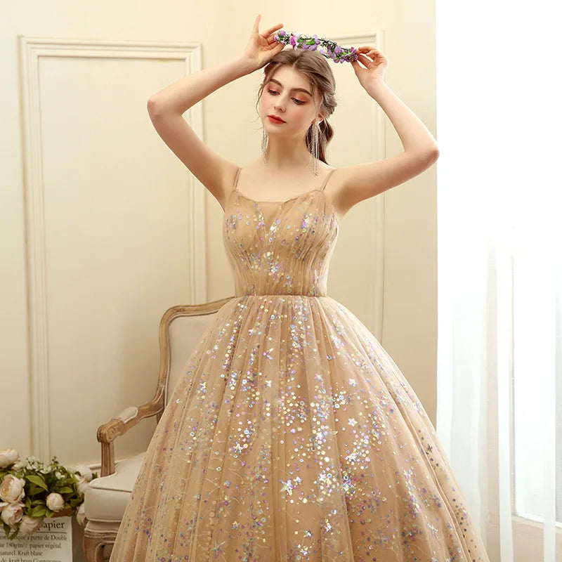 Sparkling Elegance: Unveil your inner princess with our Sexy Sling Quinceanera Dress. Adorned with shimmering sequins, this stunning gown radiates glamour. The long formal silhouette features a sophisticated design, ensuring you steal the spotlight at any party or prom. Perfect for your special 15th birthday celebration, this dress combines elegance with a touch of allure.