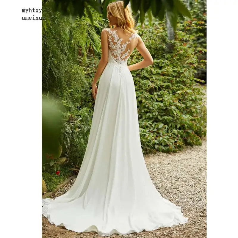 The dress boasts a classic O-neck neckline, offering a touch of sophistication and framing your face beautifully. Delicate tank sleeves add a touch of light and elegance, while a sweep/brush train creates a touch of drama as you move.
