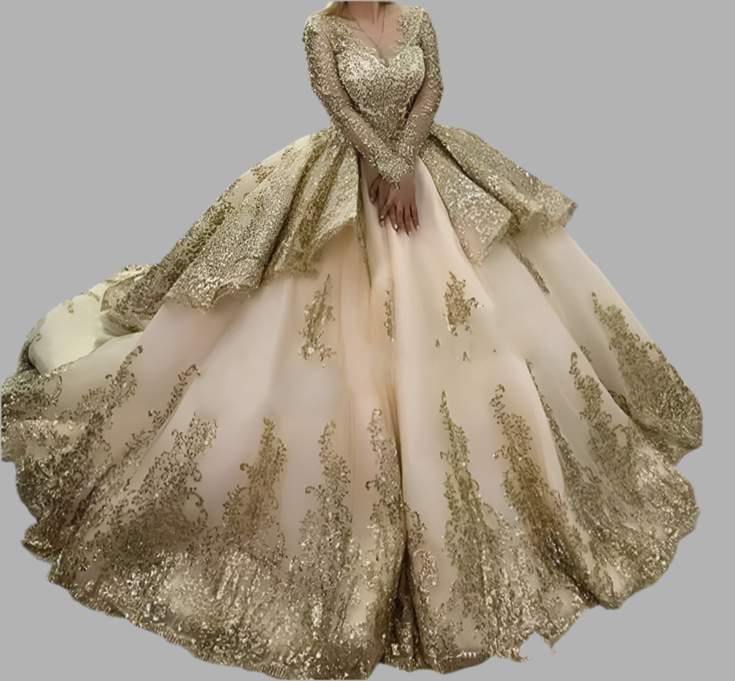 Elegant Lace Beaded Gown: Step into your fairytale with our champagne gold princess wedding dress. Adorned with intricate lace and shimmering beads, this gown features a flattering silhouette that enhances your natural curves. The long sleeves offer a touch of sophistication, while the cathedral train adds a dramatic flair. Perfect for brides seeking timeless elegance on their special day.