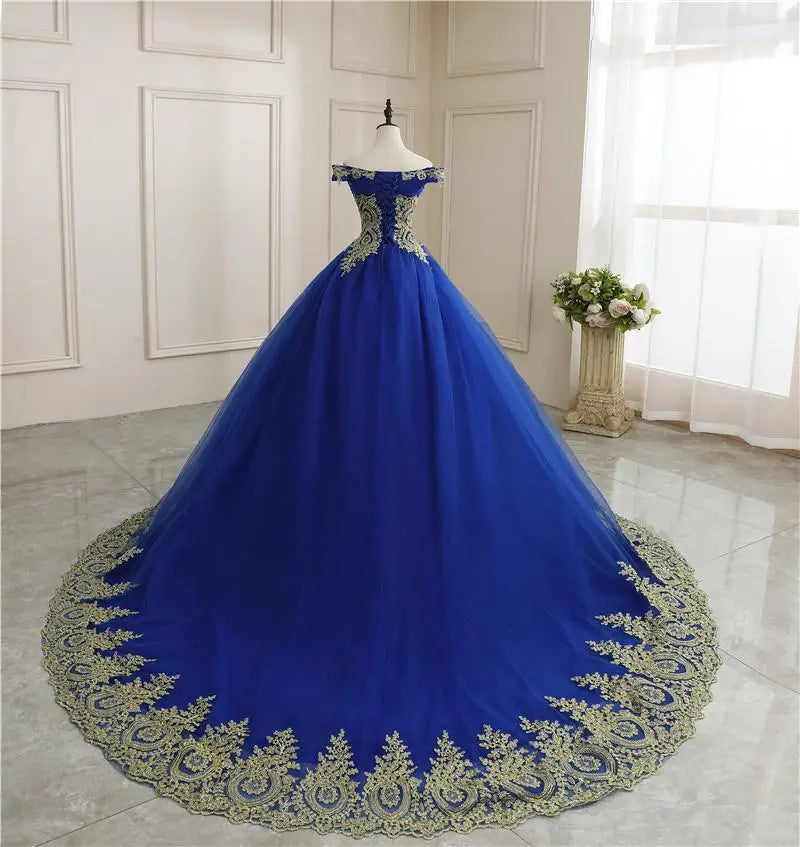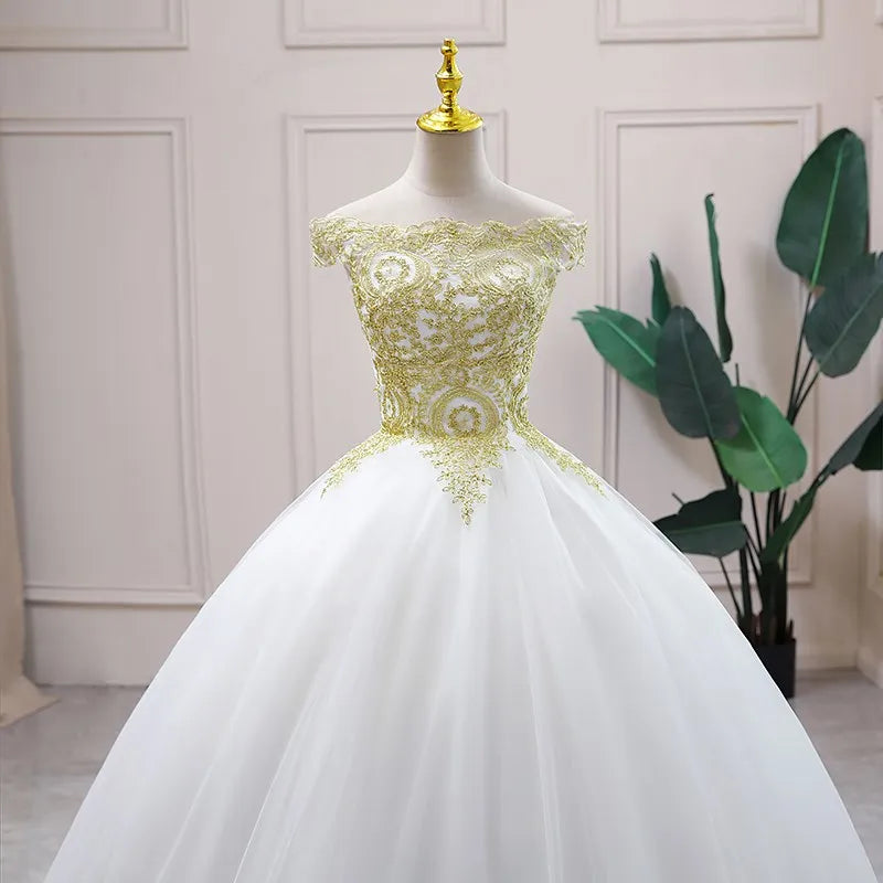 Fairy-Tale Charm: Step into a fairy-tale with this princess ball gown wedding dress. The off-the-shoulder design complements the flowing skirt, giving a soft and dreamy appearance. The champagne lace adds texture and charm without overwhelming the simplicity of the gown. Ideal for an outdoor or ballroom wedding, this dress will sweep guests off their feet with its graceful elegance and subtle shimmer. A perfect choice for brides who want to feel like royalty on their big day.