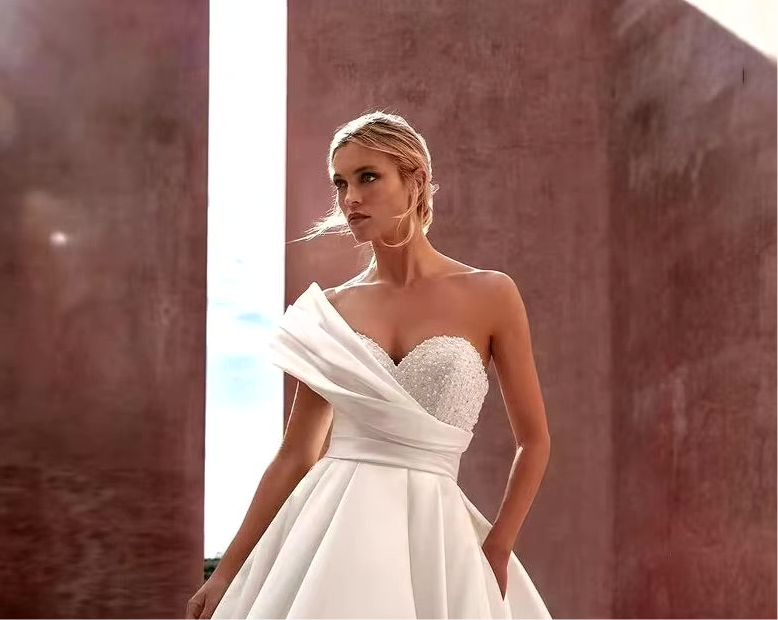 Simple A-Line Wedding Dresses: Elegant simplicity defines this A-line wedding dress, crafted to enchant with its timeless silhouette. Featuring a modest yet flattering cut, the dress flows gracefully to the floor, emphasizing a bride's natural beauty. Perfect for traditional or contemporary ceremonies, it offers versatility and understated sophistication."