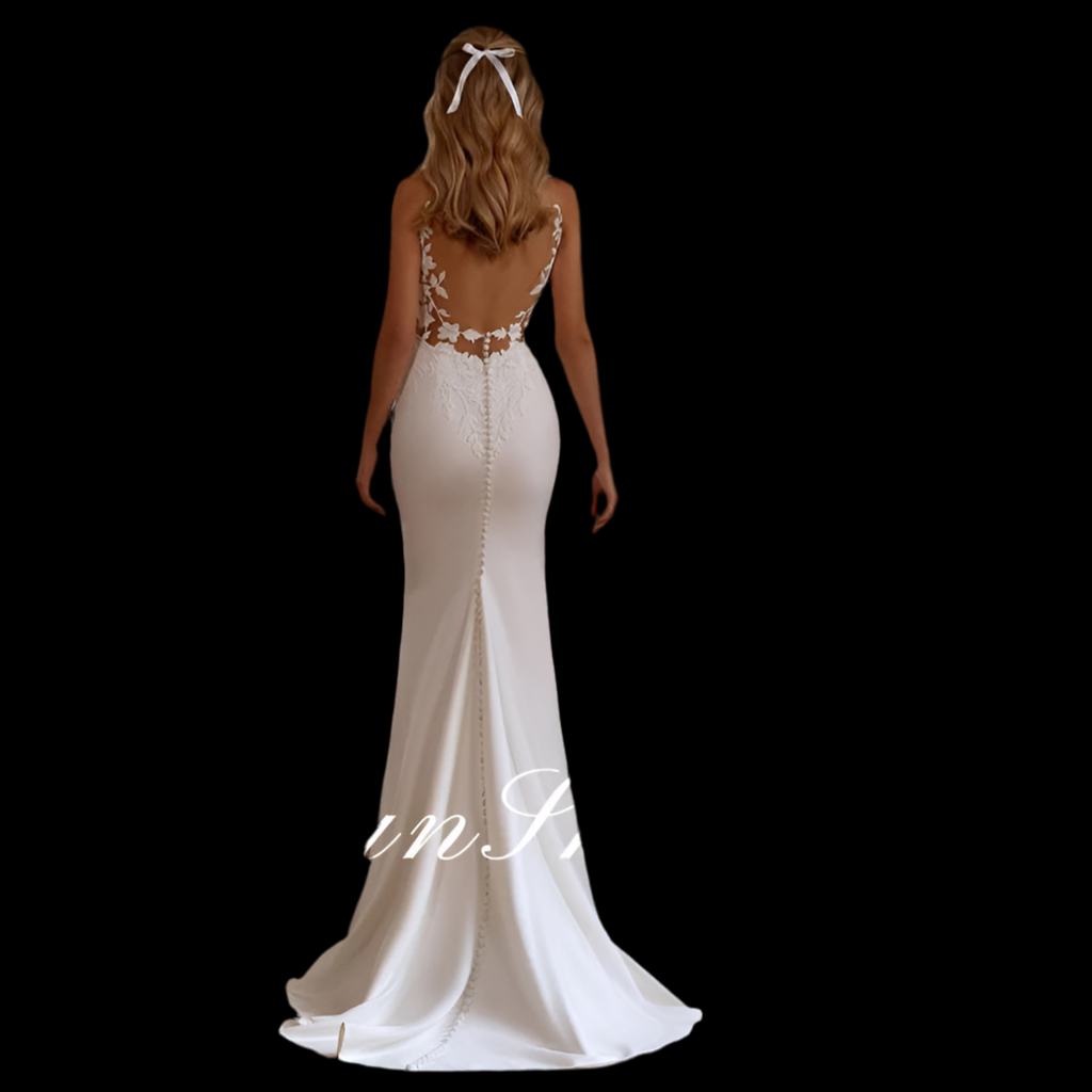 Graceful sophistication meets timeless allure in our Mermaid Wedding Dress, featuring a stunning open back and delicate lace details.