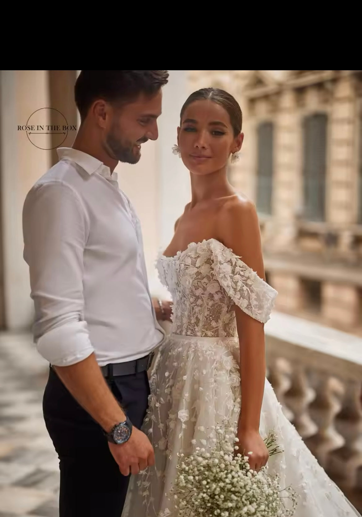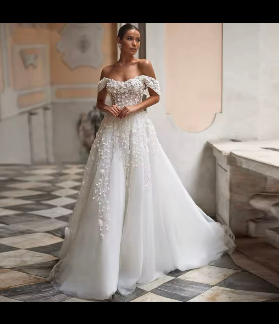 The off-the-shoulder neckline adds a touch of alluring romance, showcasing your delicate collarbones and shoulders. Delicate lace appliques adorn the bodice, adding a touch of vintage whimsy. Cascading tiers of soft tulle create a voluminous and ethereal skirt, making you feel like a princess on her wedding day.