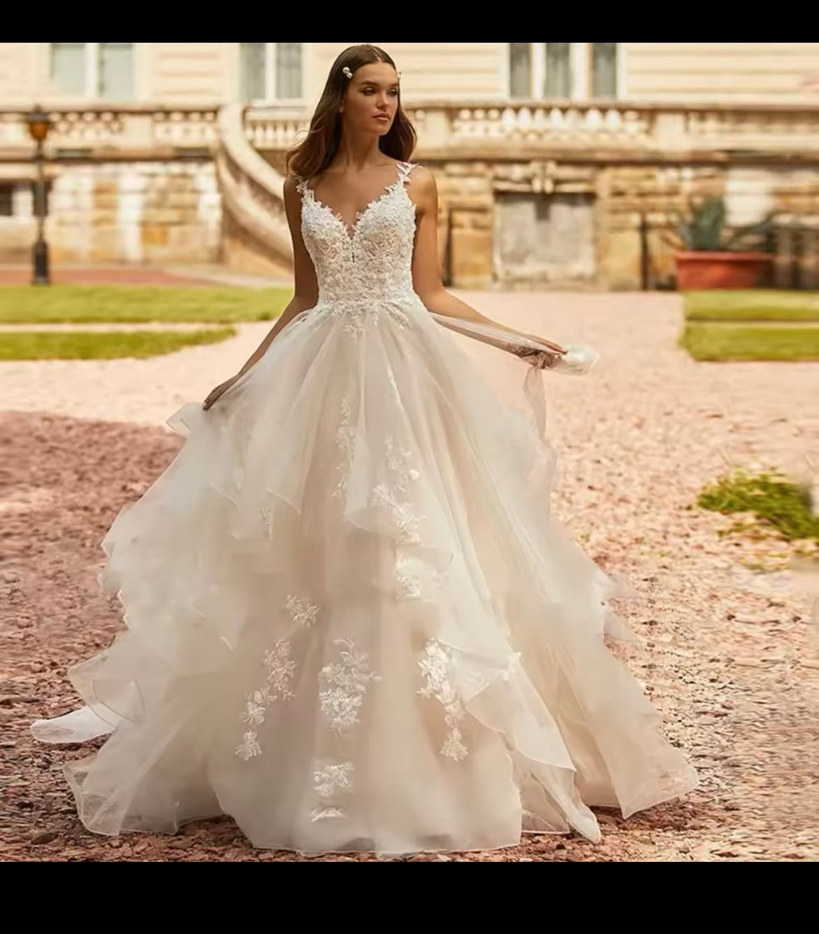 The V-neckline flatters the bust and collarbone, while the sleeveless design allows you to showcase your arms or add stunning statement jewelry. The true star of the show, however, is the exquisite tiered lace appliques that adorn the bodice and skirt. This intricate detailing adds a touch of luxury and romance, making you feel like the true star on your wedding day.