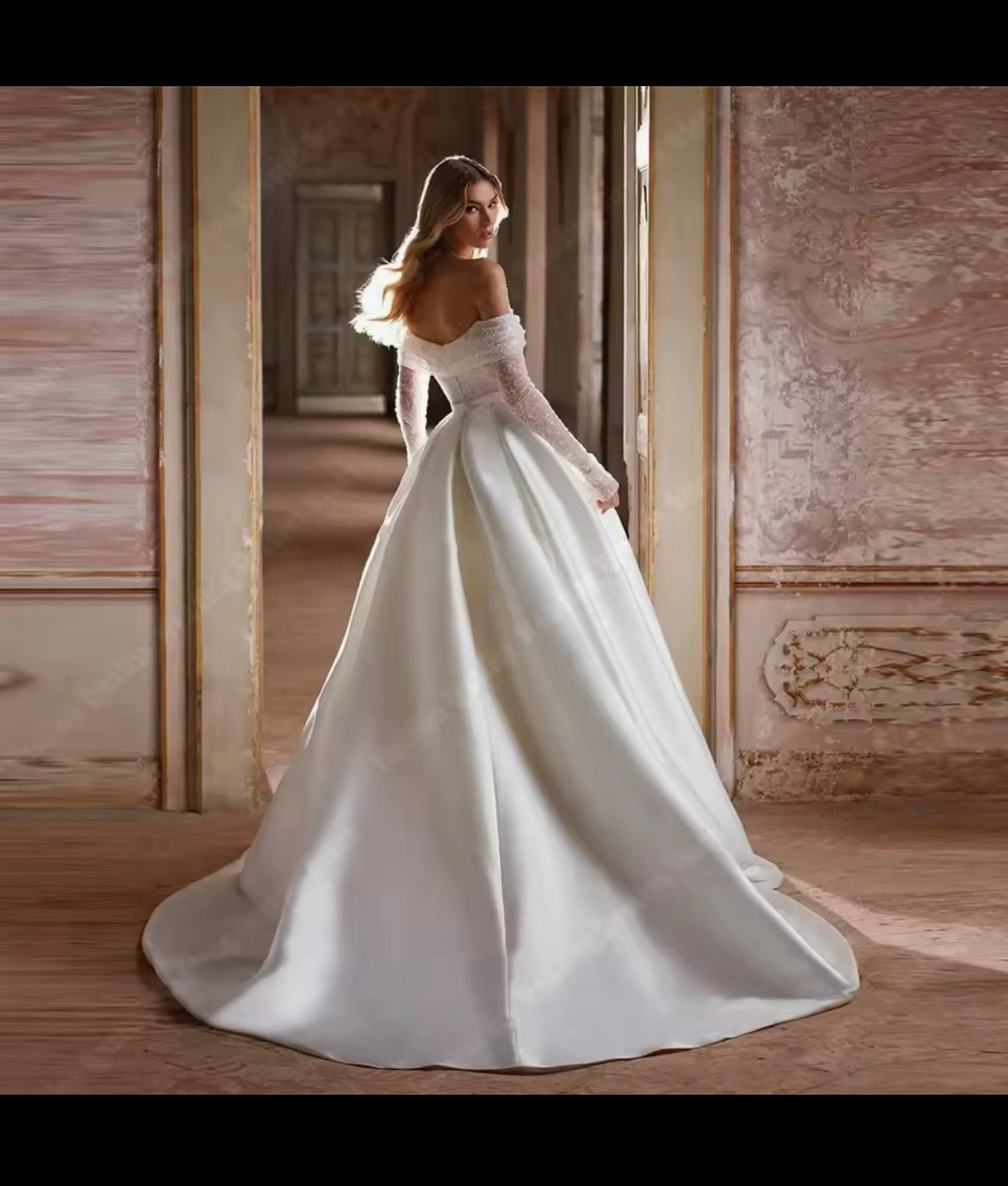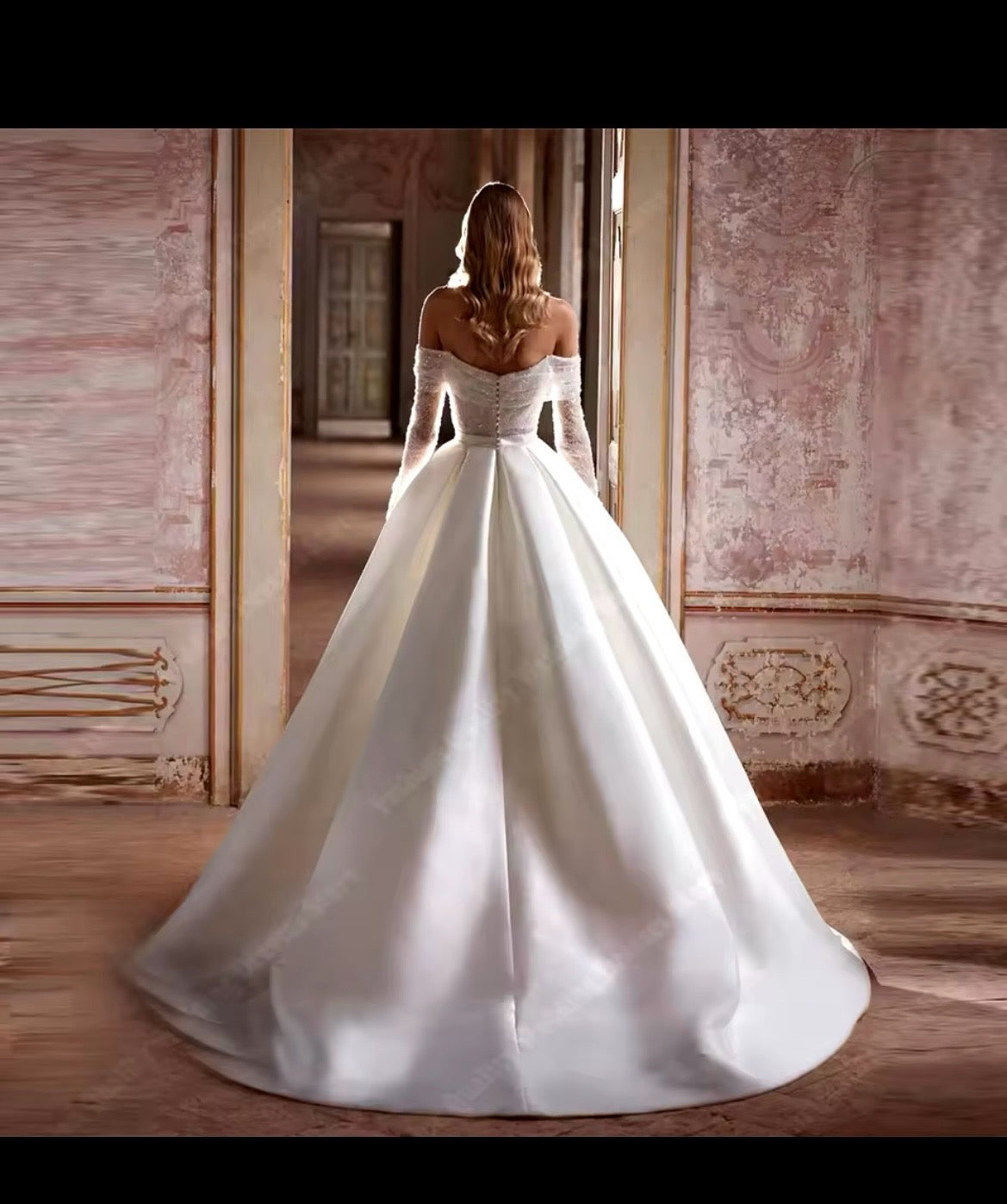Long Sleeve Satin Princess Robe De Mariée: Indulge in regal charm with our Long Sleeve Satin Princess Wedding Gown. Featuring a princess-style silhouette and long sleeves crafted from luxurious satin, this dress exudes sophistication and grace. Ideal for brides looking to channel a fairy-tale princess vibe on their wedding day, ensuring a memorable and enchanting presence.