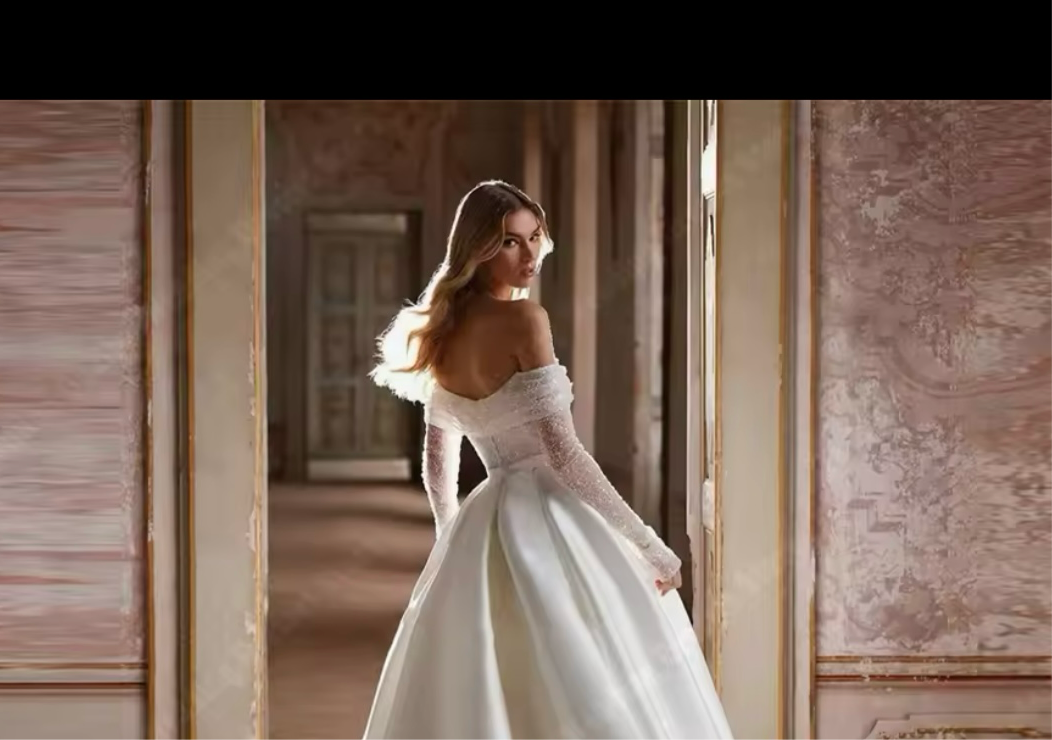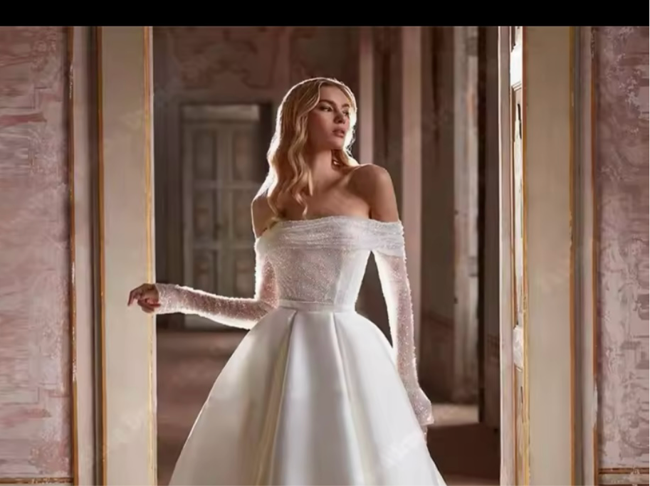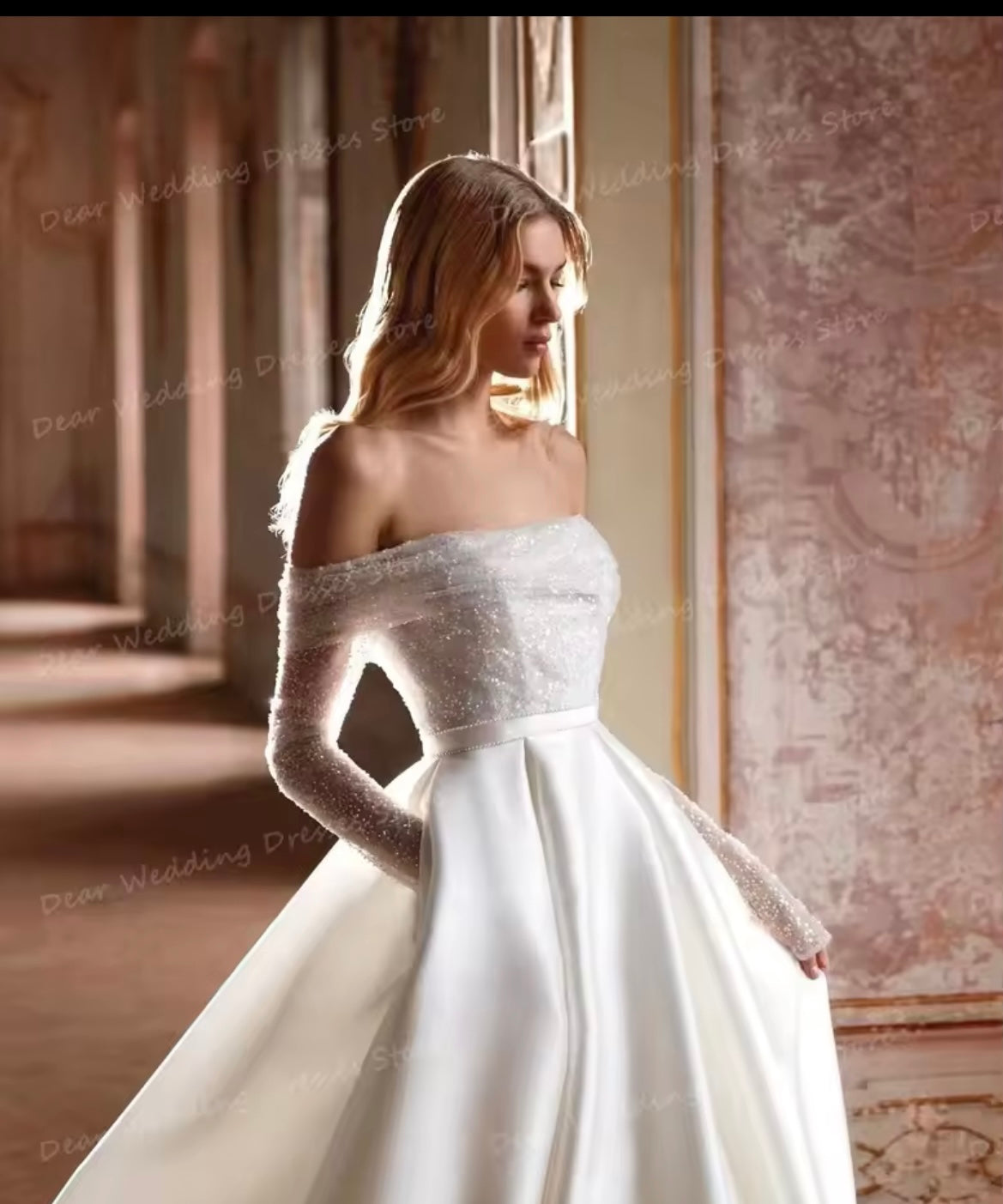 A Line Glitter Off The Shoulder Woman‘s Bridal Gowns: Shine with understated glamour in our Glitter Off-The-Shoulder Bridal Gown. Designed in an A-line silhouette, this dress combines the allure of off-the-shoulder sleeves with a sprinkle of subtle glitter that catches the light beautifully. Perfect for the modern bride who desires a touch of sparkle without compromising on elegance.