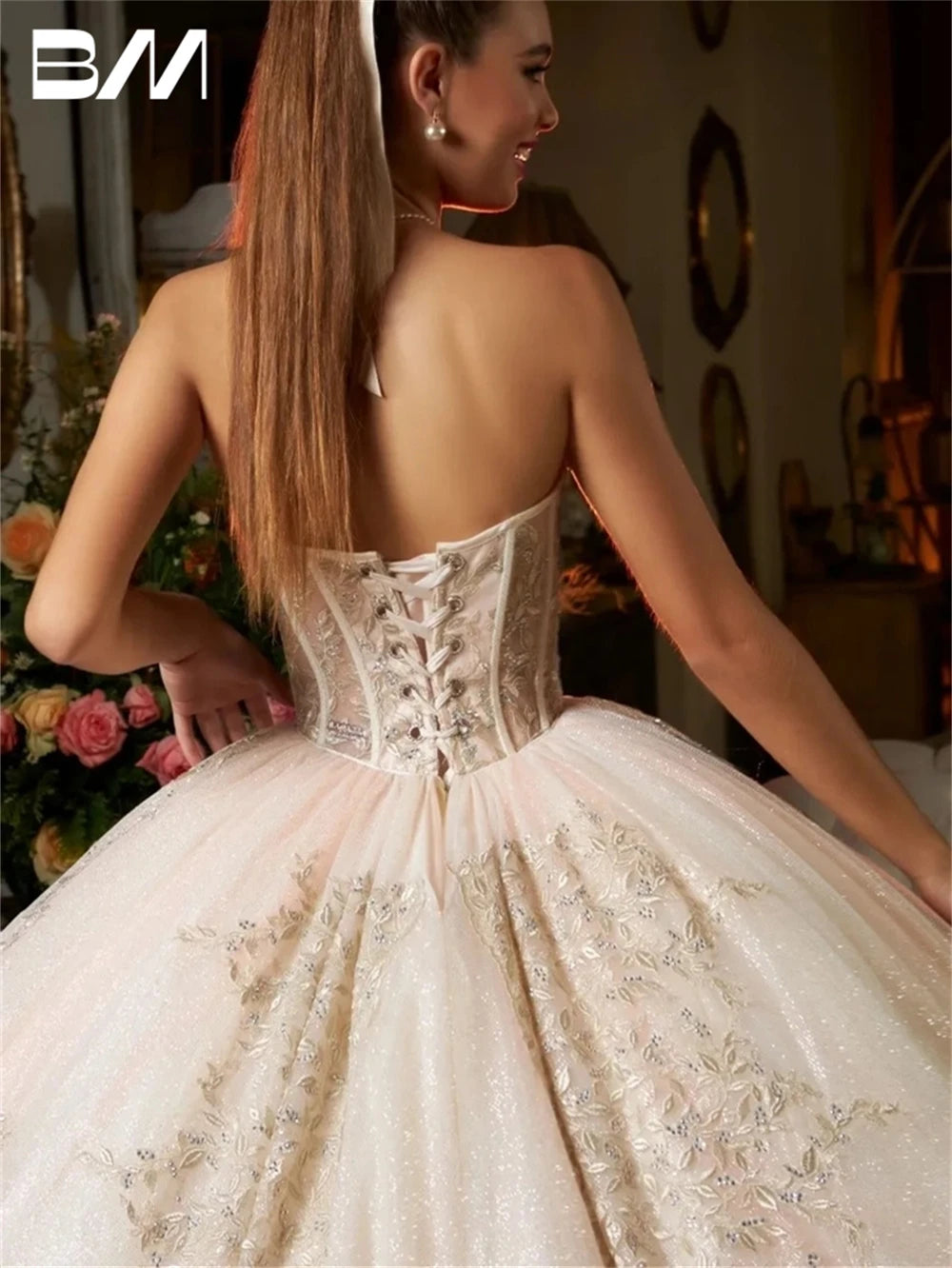 Ball Gown Silhouette: Features a classic ball gown silhouette, flattering all body types with its fitted bodice and voluminous skirt. The corset back not only enhances the gown's fit but also adds a romantic and adjustable closure.