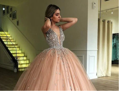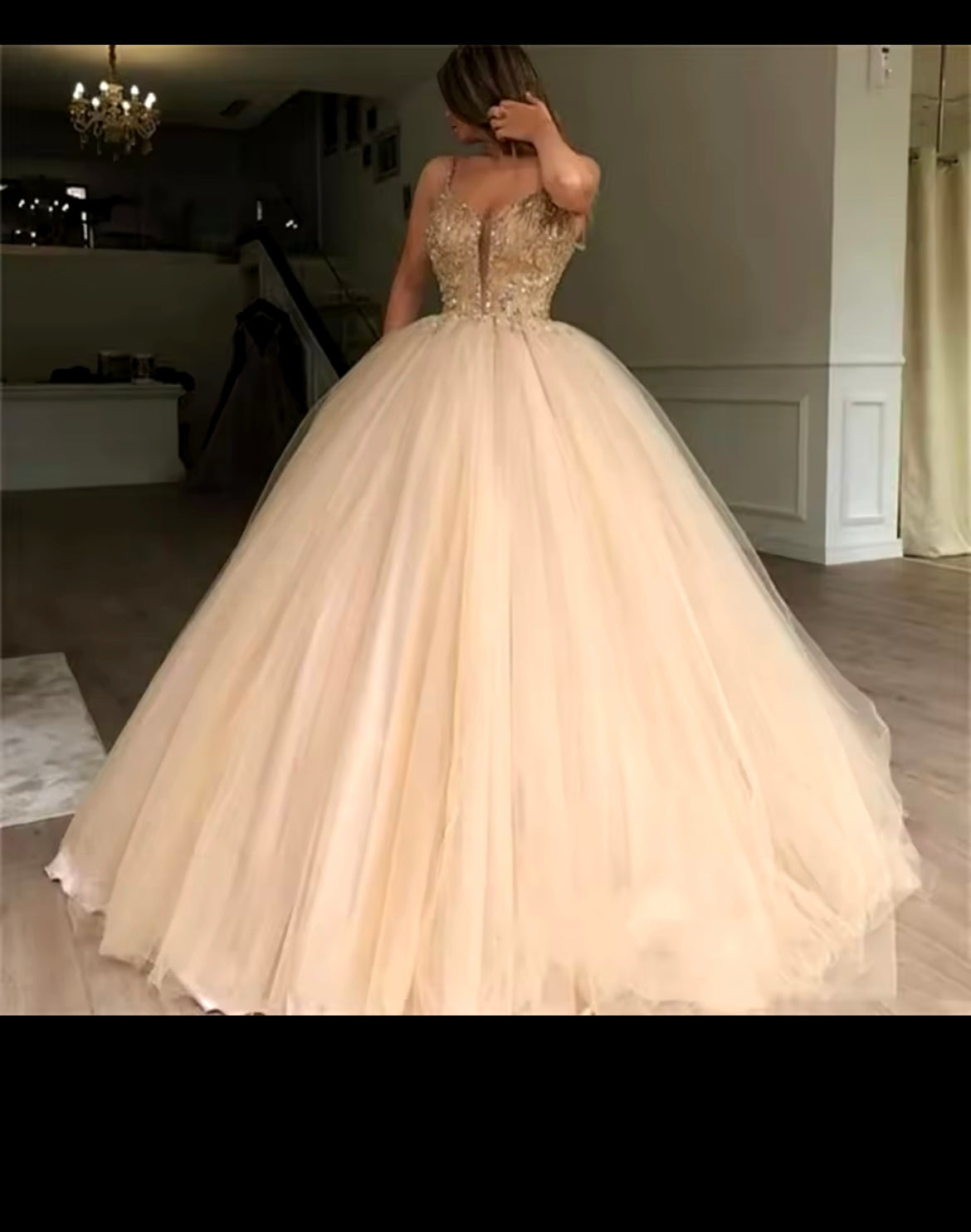 Puffy Tulle Quinceañera Dress: Turn heads in this beautiful gold quinceañera gown. The puffy tulle layers add volume and movement, making it perfect for twirling on the dance floor. The V-neckline offers a sophisticated look, while the full skirt gives it the iconic ball gown feel. Ideal for anyone looking to feel like royalty.