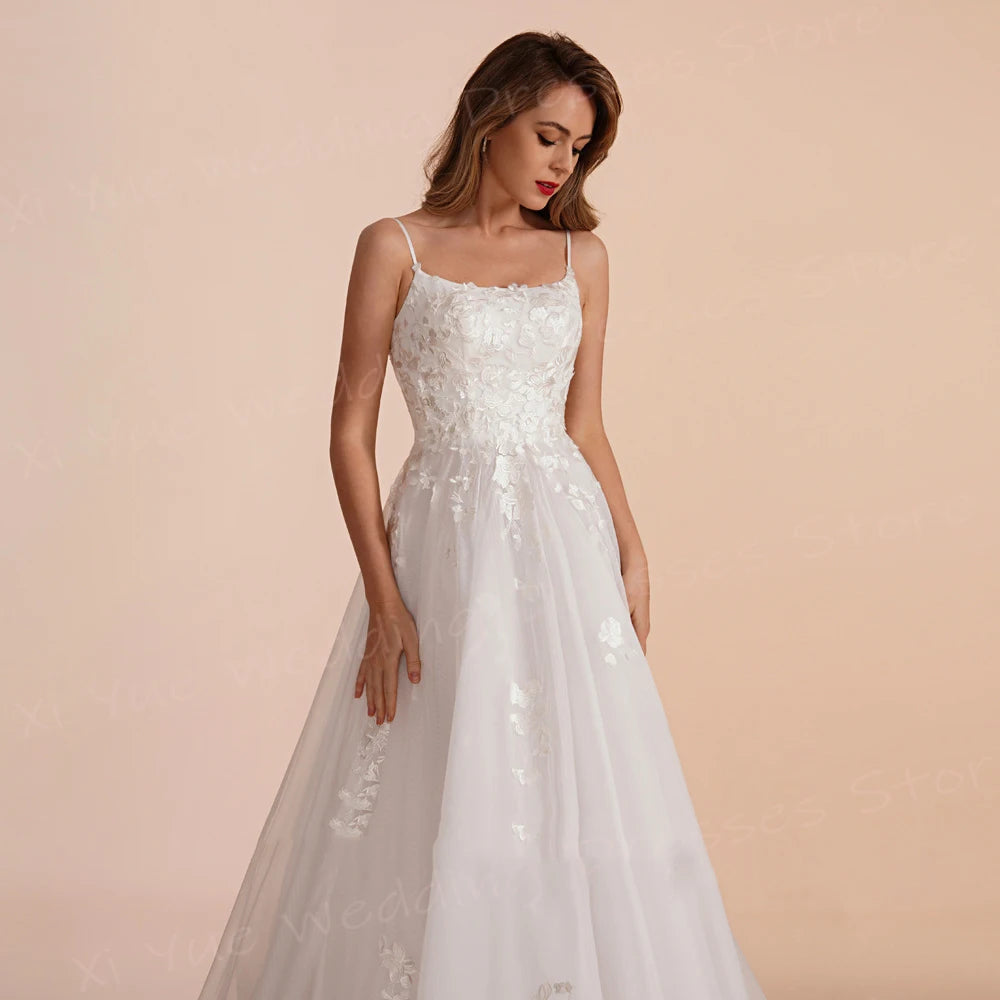 Spaghetti Straps Sleeveless Vestido De Noivas: "Embrace timeless romance in this Sleeveless Vestido De Noivas adorned with delicate spaghetti straps. The gown's sleeveless design and flowing silhouette create a graceful look, complemented by its intricate lace details. Ideal for the bride seeking a blend of modern style and classic allure on her wedding day."