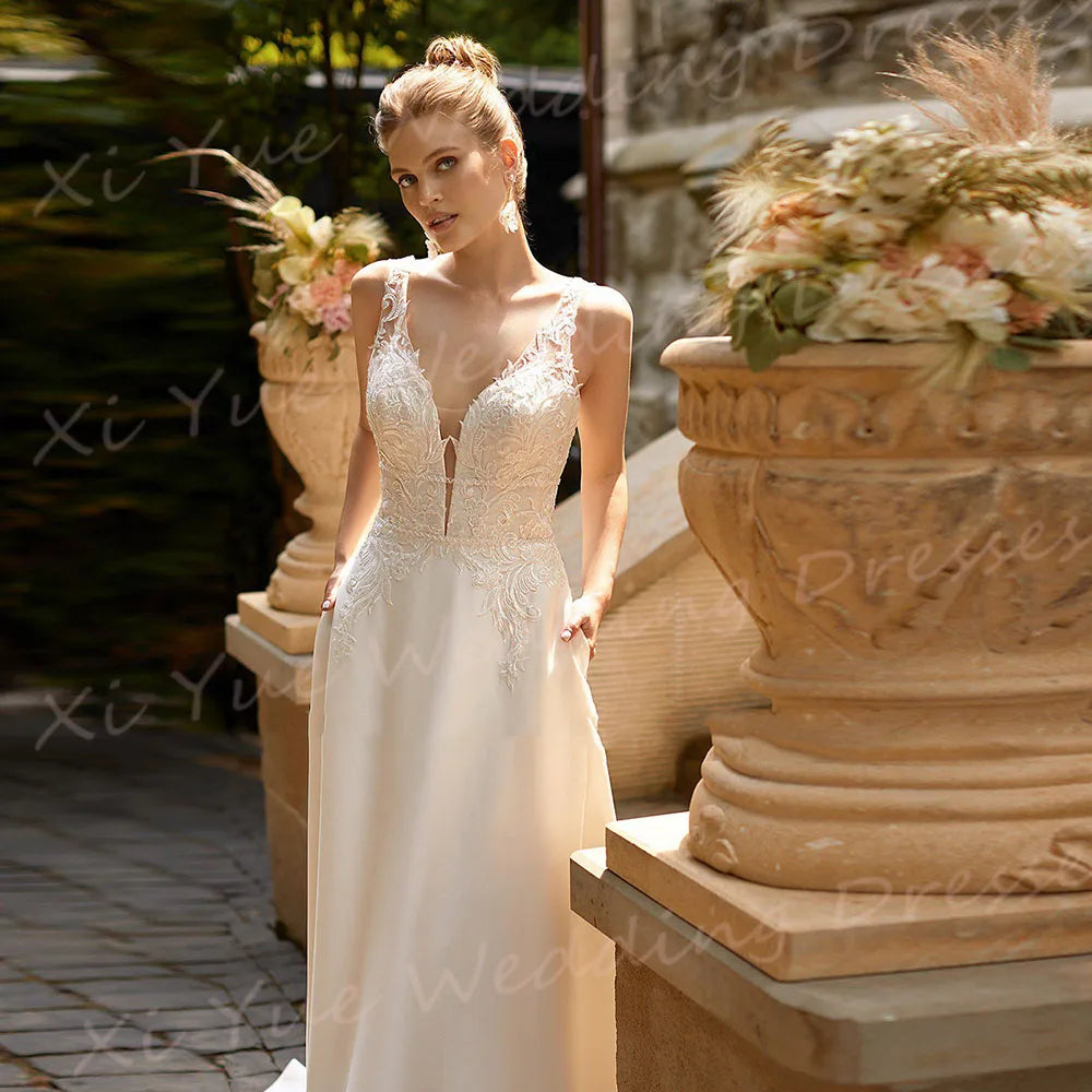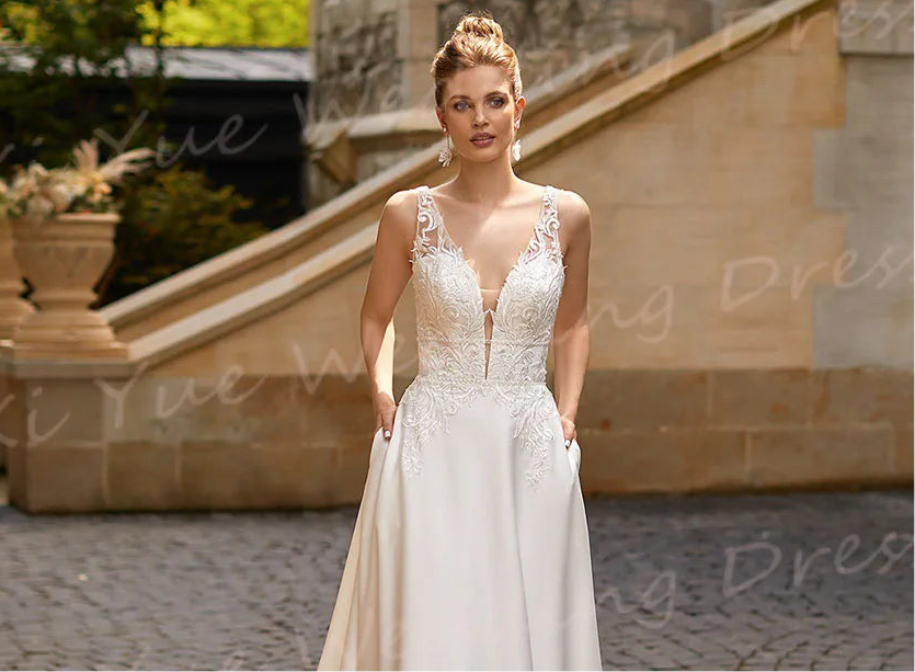 Sexy V Neck A Line Women's Wedding Dresses: Embrace elegance with our Sexy V Neck A Line Women's Wedding Dress. Crafted with meticulous detail, this gown features exquisite appliques lace that adds a touch of sophistication. The graceful sleeveless design and backless cut ensure a stunning silhouette, making it perfect for the modern bride seeking both allure and timeless charm. Ideal for weddings where every detail counts, this dress promises to captivate and enchant.