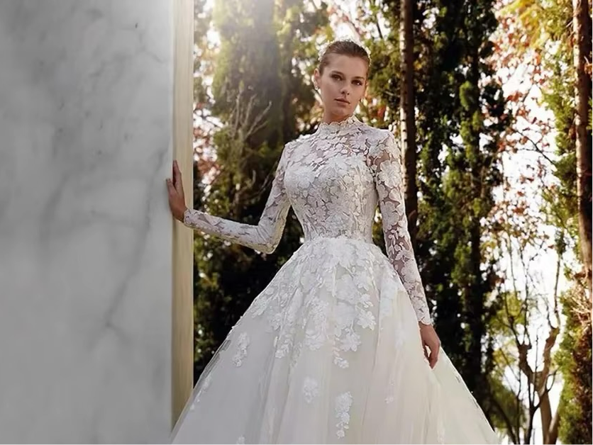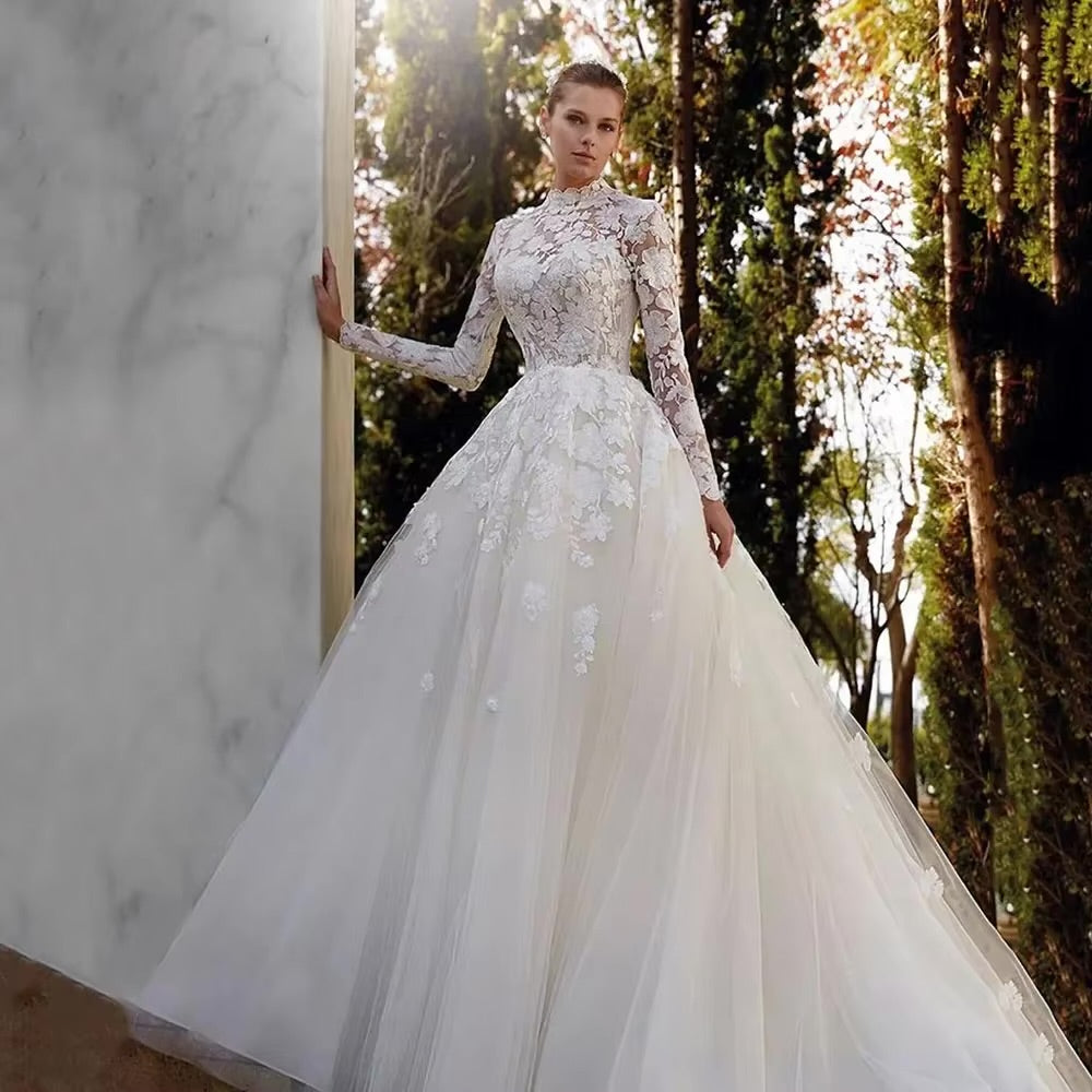 High Neck Long Sleeves Lace Appliques Wedding Dress For Women: Embrace romance with our High Neck Long Sleeves Wedding Dress, designed to enchant and captivate. The high neckline adds a modern twist to its classic silhouette, while the intricate lace appliques evoke a sense of timeless beauty. Perfectly tailored sleeves cascade delicately, offering a touch of modesty and sophistication. Ideal for the bride who seeks elegance and grace, this dress promises to fulfill every princess bride's dream.