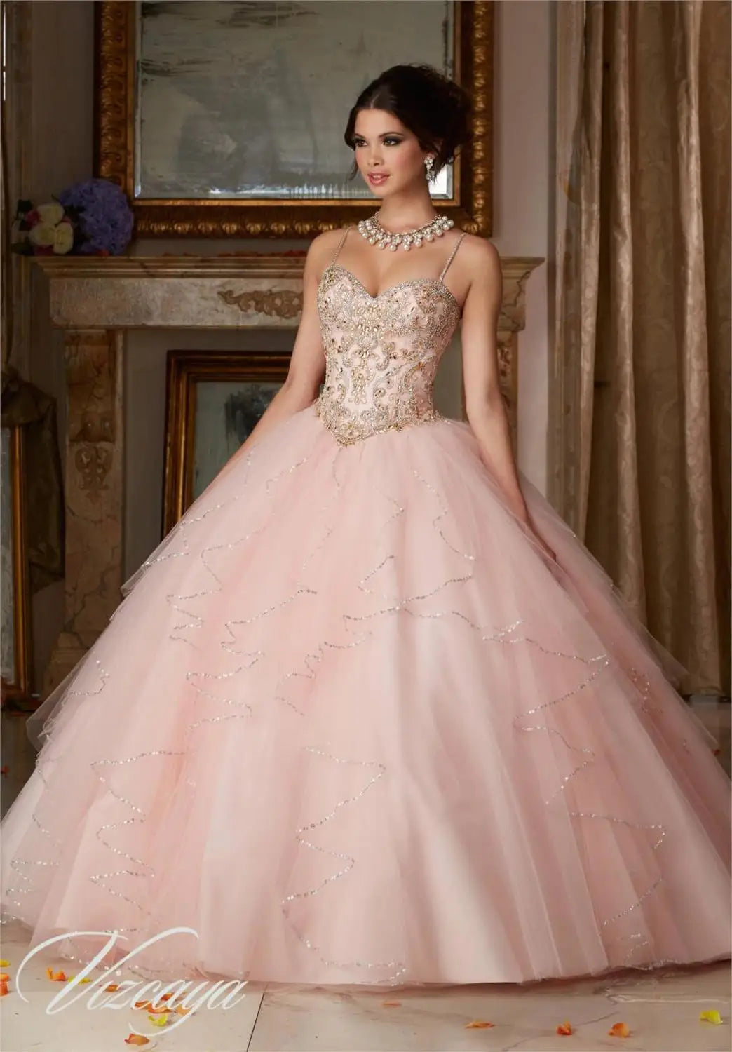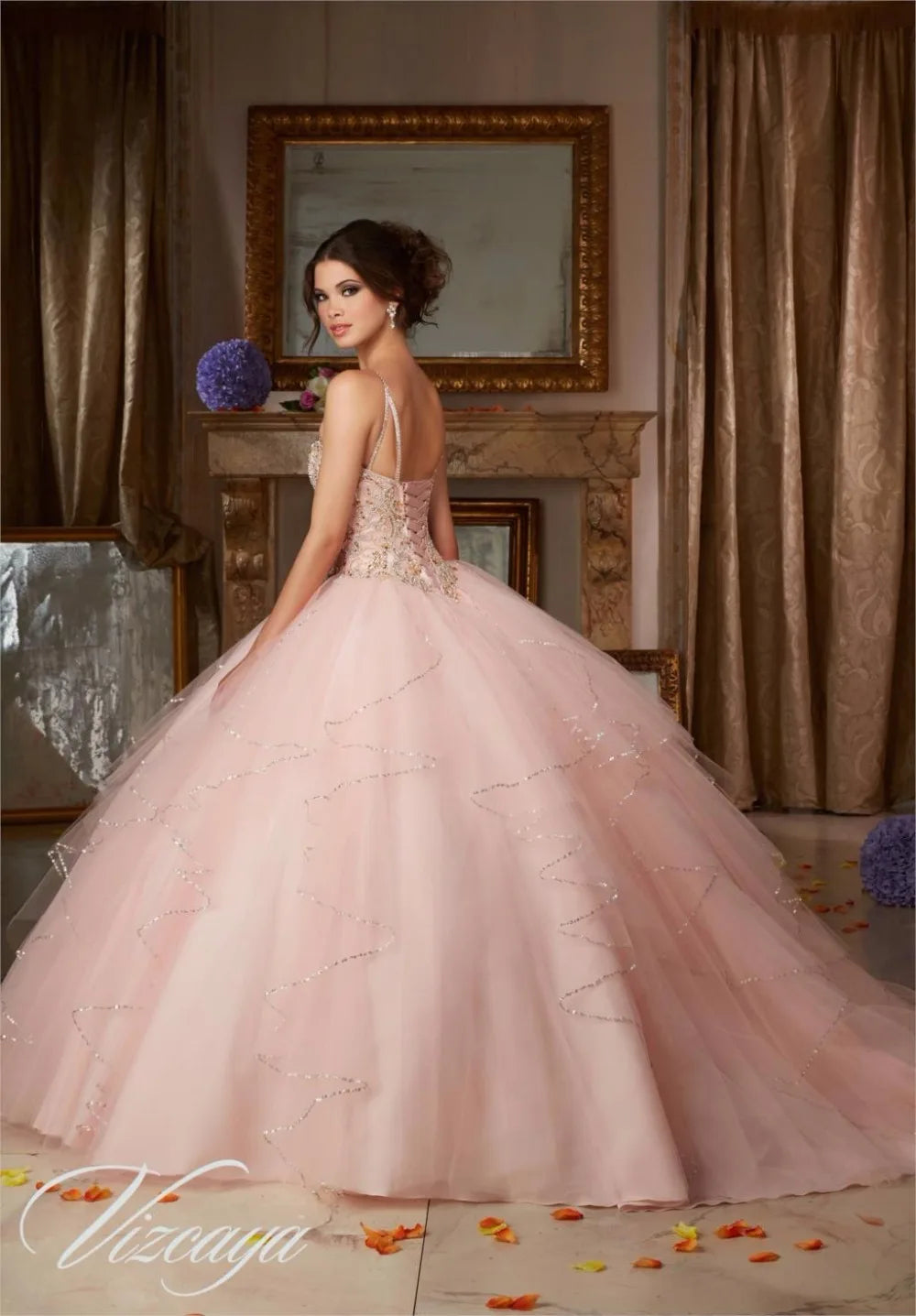 Crystal Beaded Sweet 16 Gown: The intricate crystal beading and vibrant organza fabric make this gown a top choice for Sweet 16 or Quinceañera. Its voluminous ruffles and color scheme add a touch of modern elegance.