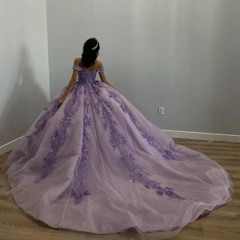 Fairytale Dream: Embrace your inner princess in this fairytale lilac gown. The puffy ball gown silhouette, adorned with stunning appliques, is complemented by elegant long sleeves. Make unforgettable memories in this dreamy dress designed for your special celebration.