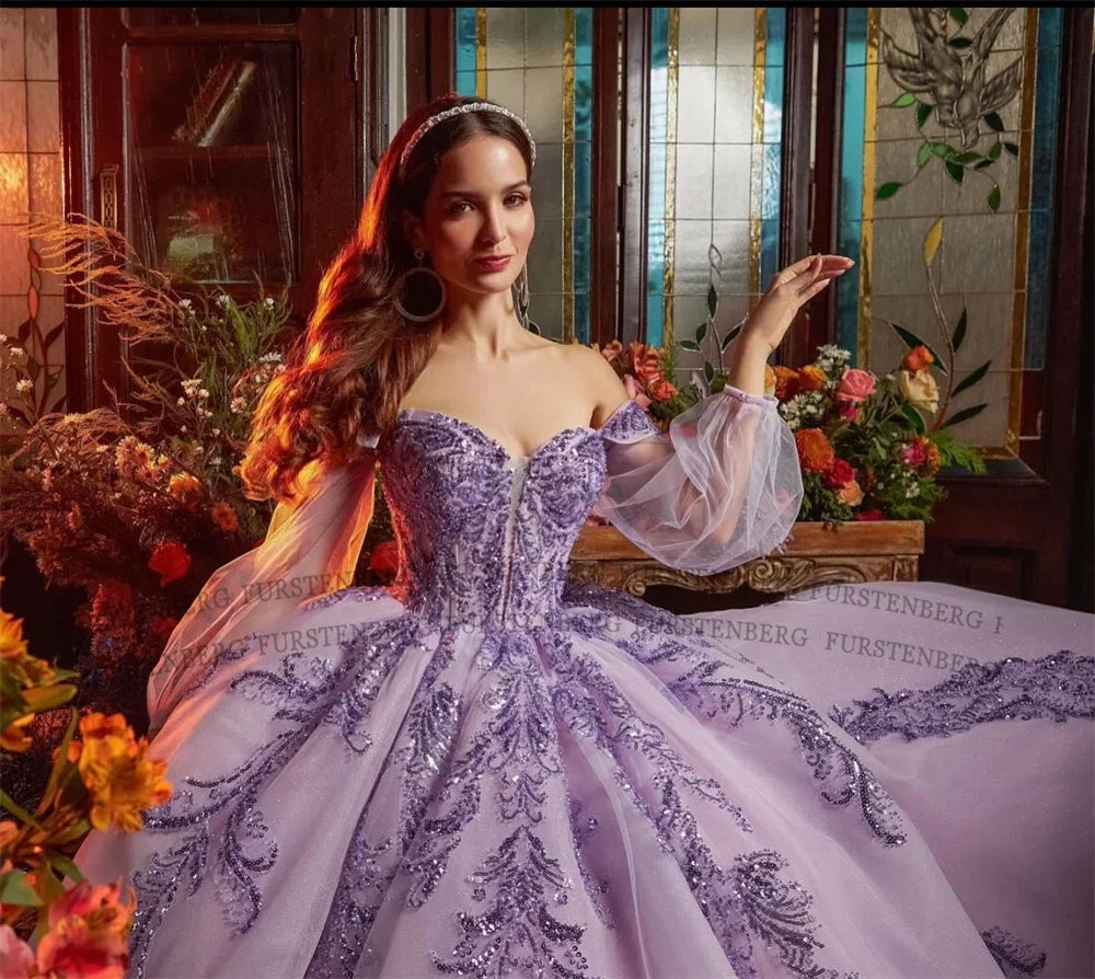 Dreamy Elegance: This stunning lilac quinceañera dress features a puffy ball gown silhouette, perfect for making a statement. Adorned with intricate appliques, it exudes elegance and charm. The long sleeves add a touch of sophistication, making it ideal for any special occasion.