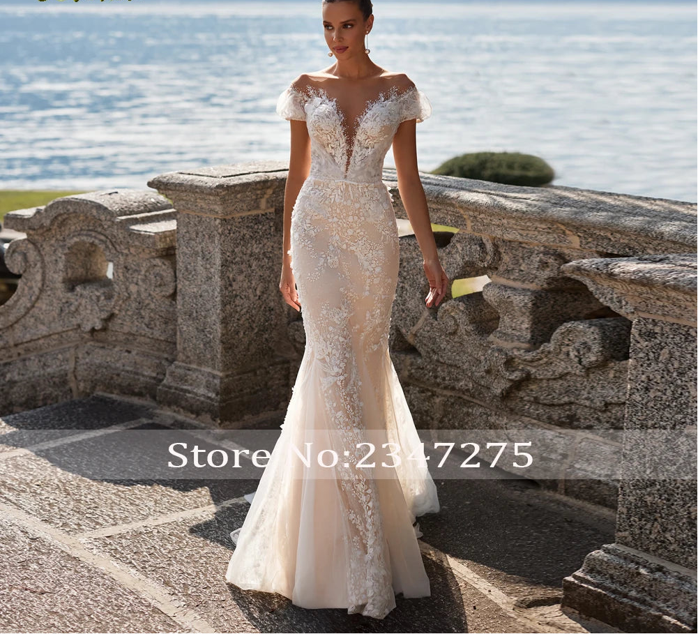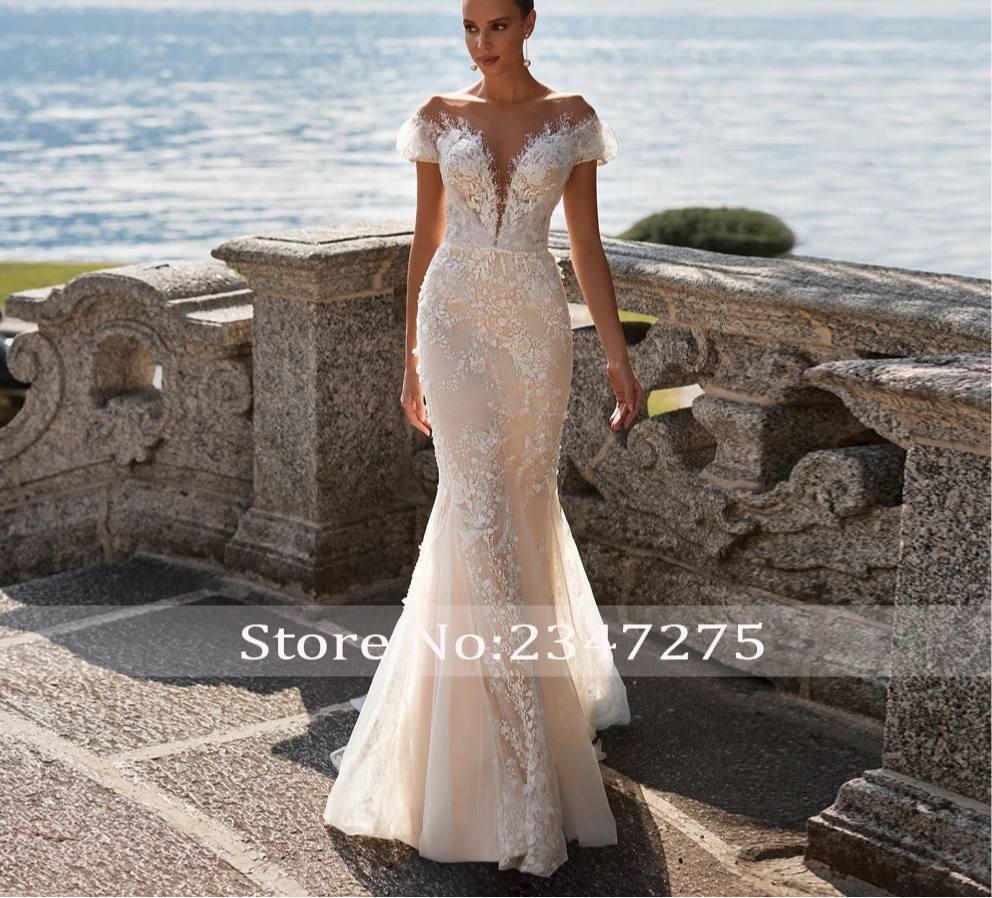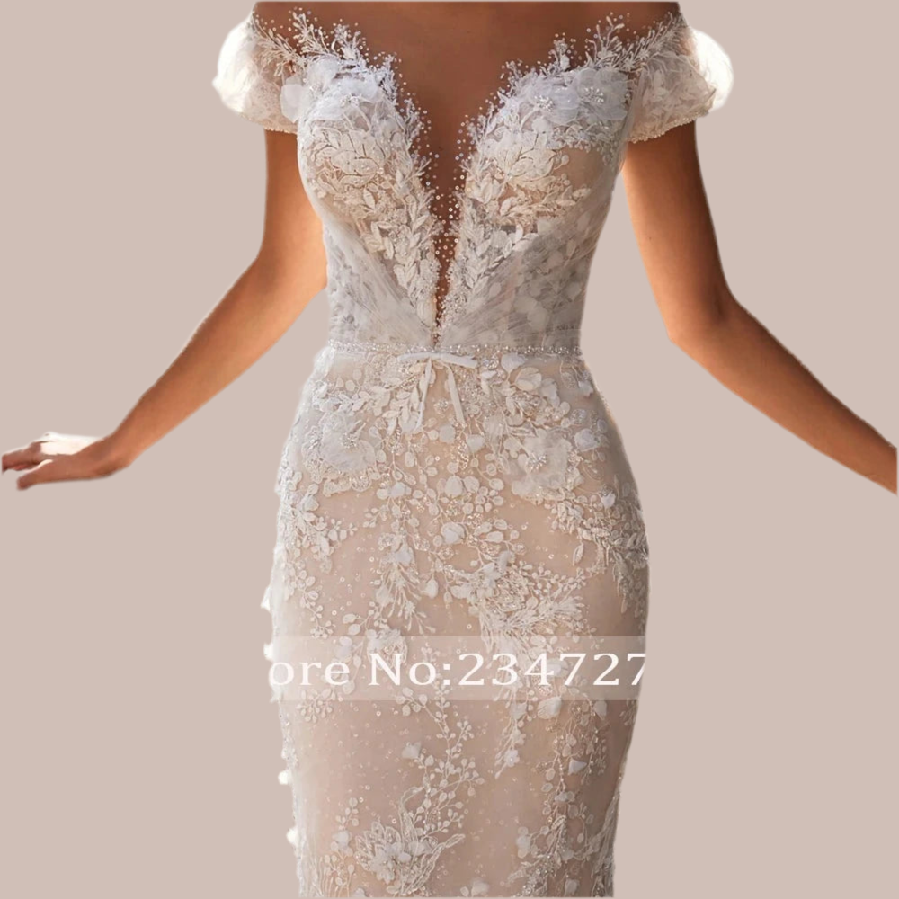 Mermaid Graceful Wedding Dress V-Neck Cap Sleeve: This stunning Mermaid Graceful Wedding Dress features a flattering V-neckline and delicate cap sleeves. Crafted from luxurious lace, it exudes timeless elegance and romance, perfect for making your special day unforgettable.
