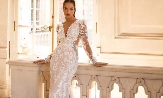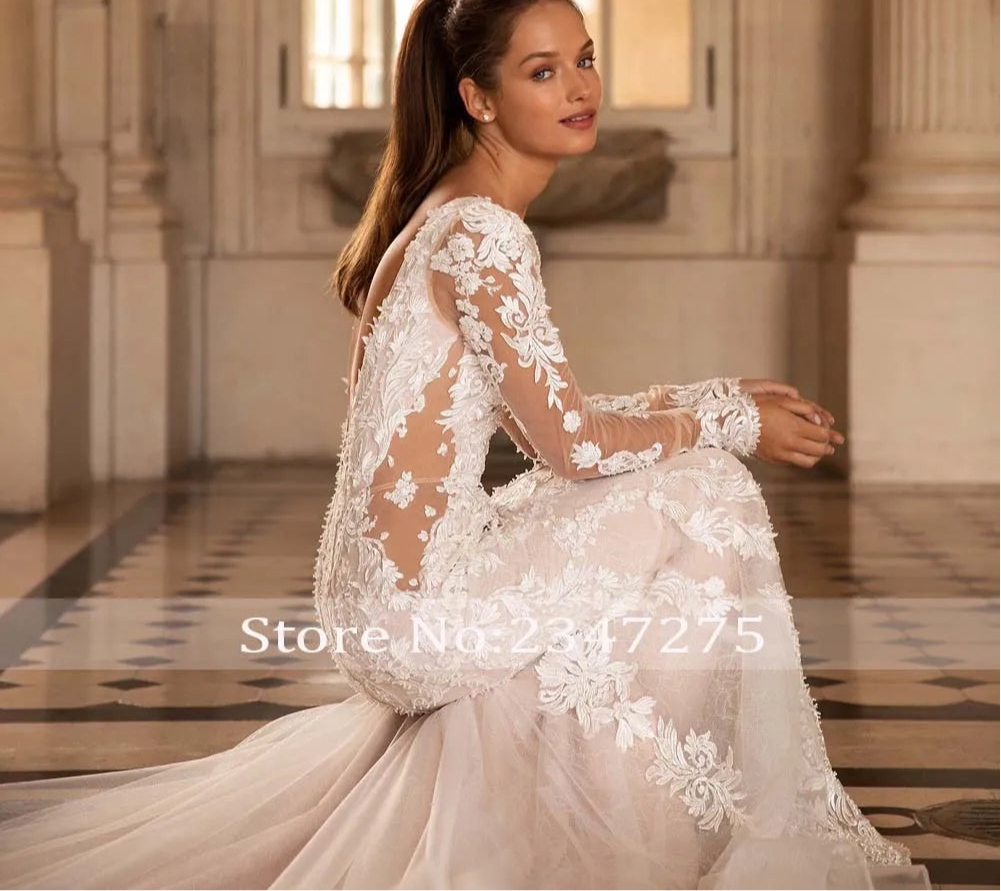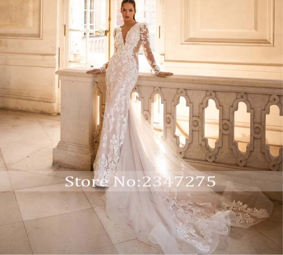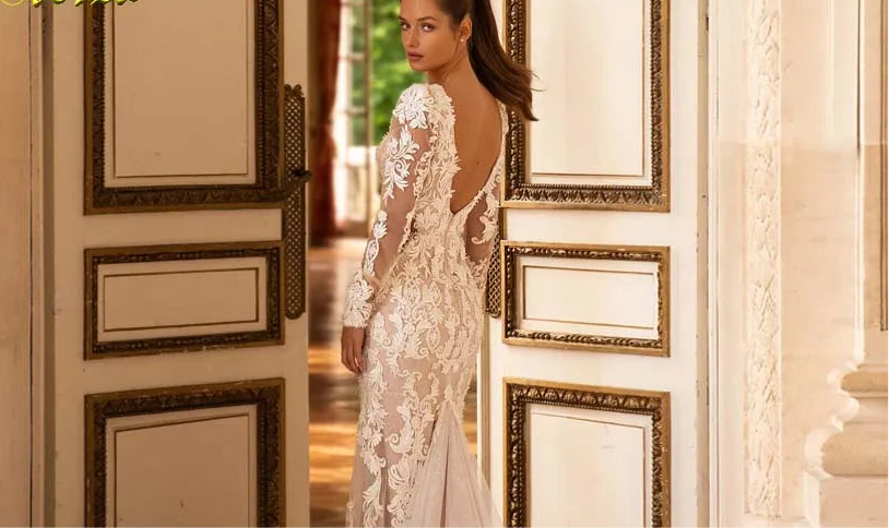 Mermaid Elegant Wedding Dresses: Embrace timeless elegance with our Mermaid Elegant Wedding Dress. Crafted to enchant, this dress features a graceful V-neckline and long sleeves that add a touch of sophistication. Intricate appliques embellish the gown, while its backless design exudes allure and modern charm. Perfect for the bride seeking a glamorous and unforgettable entrance on her special day.
