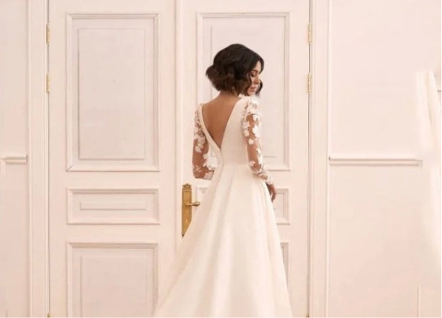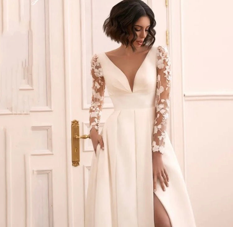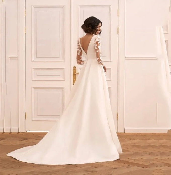Morden Satin A Line Wedding Dresses: Embrace elegance with our Modern Satin A-Line Wedding Dress, designed to captivate with its timeless allure. Crafted from luxurious satin, this gown features a flattering A-line silhouette that enhances your natural grace. The V-neckline and full sleeves are adorned with delicate lace appliques, adding a touch of romance and sophistication. Perfect for the modern bride seeking a blend of classic charm and contemporary style. Sweep gracefully down the aisle in this Vestido de Novia that promises to make your special day unforgettable.