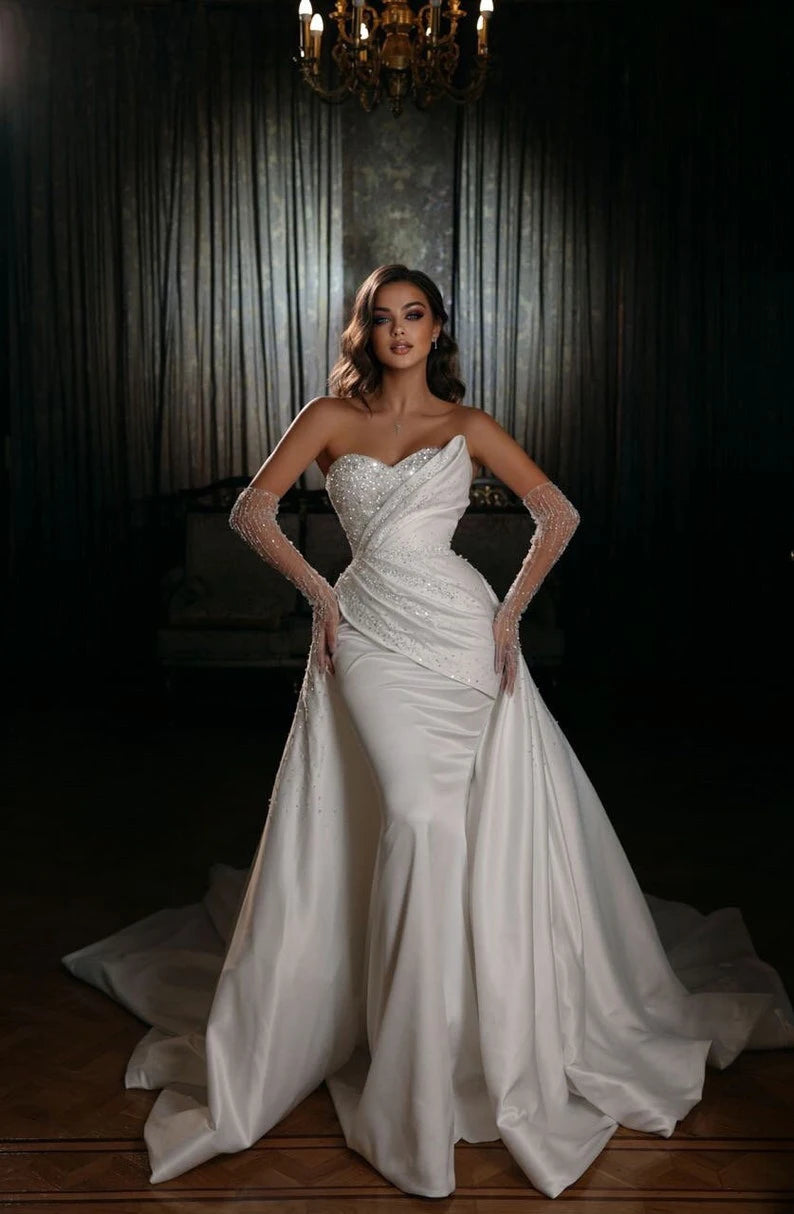 Mermaid Silhouette: The mermaid silhouette hugs the body through the bodice and hips, then flares out into a beautiful floor-length skirt, creating a stunning hourglass figure.
