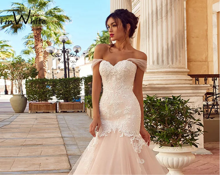 Sexy Trumpet Lace Wedding Dresses: Embrace timeless elegance with our Sexy Trumpet Lace Wedding Dress. Crafted with exquisite lace detailing, this dress exudes sophistication and allure. The trumpet silhouette flatters every curve, while the off-the-shoulder neckline adds a touch of romance. Perfect for the bride who wants to make a statement on her special day.