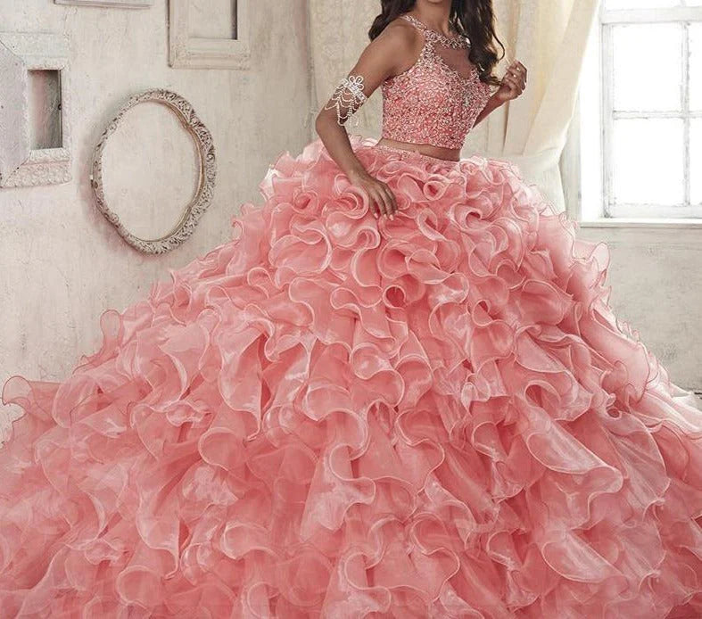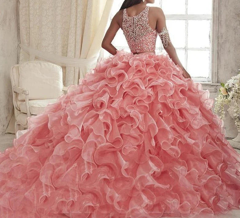 Affordable Sweet 16 Gown: Celebrate your Sweet 16 in style with this affordable yet exquisite two-piece gown. The eye-catching organza fabric flows beautifully, while the crystal embellishments add a touch of sparkle. This dress combines comfort and glamour, ensuring you look fabulous throughout the festivities.
