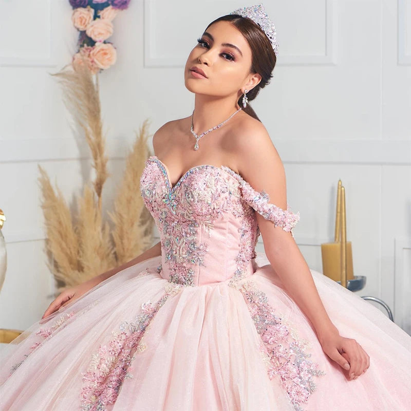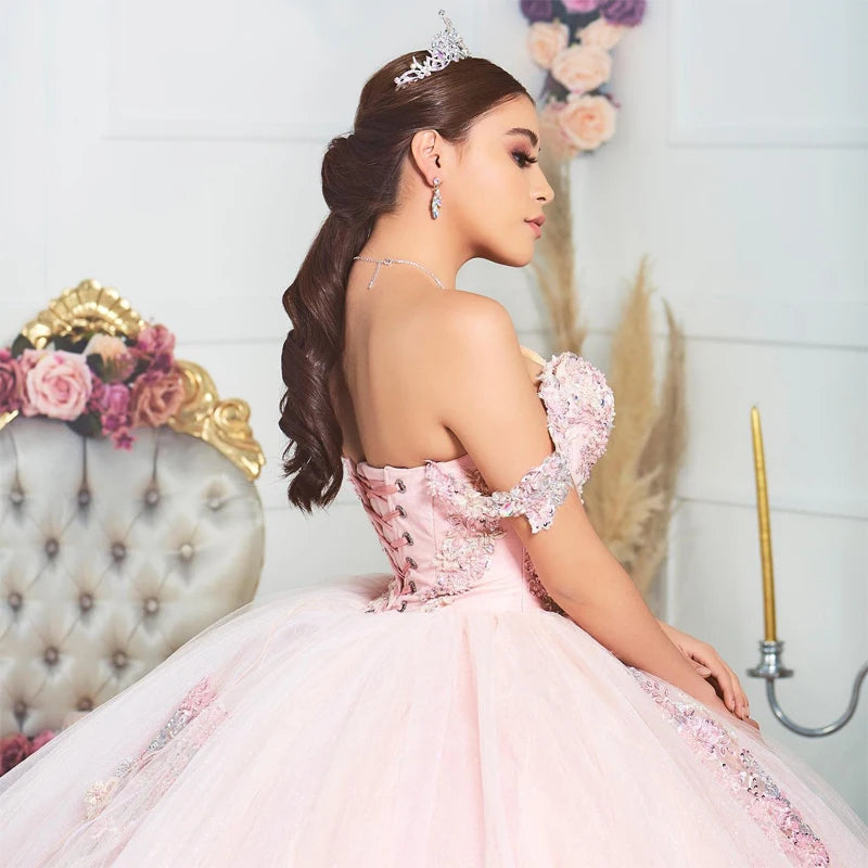 Elegant Off-Shoulder Design: Make your special day unforgettable with our Pink Sweetheart Ball Gown. This stunning gown features an elegant off-shoulder design that beautifully frames the shoulders, enhancing your natural grace. The sweetheart neckline adds a romantic touch, making it perfect for a quinceañera or any birthday celebration. Crafted with intricate lace appliqué and shimmering beading, this dress exudes sophistication and charm. The voluminous tulle skirt flows effortlessly, giving you the magical feeling of a princess on your special day. Whether you're dancing the night away or posing for photos, this gown will have you looking and feeling your best. Available in various sizes, this dress ensures a perfect fit for every celebration.