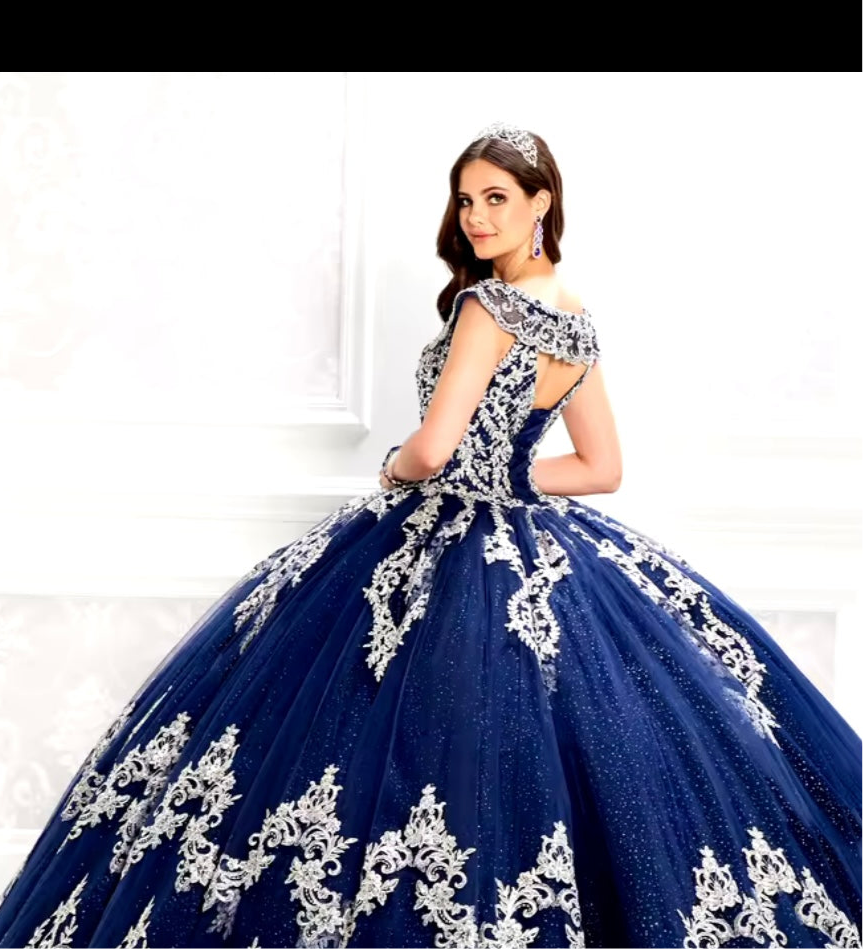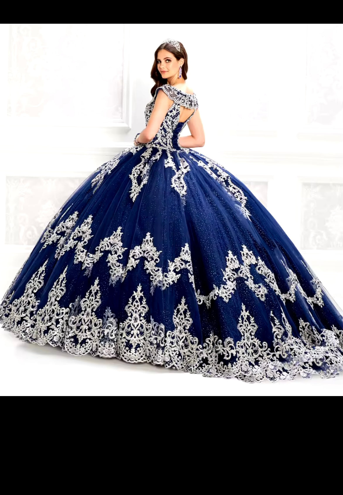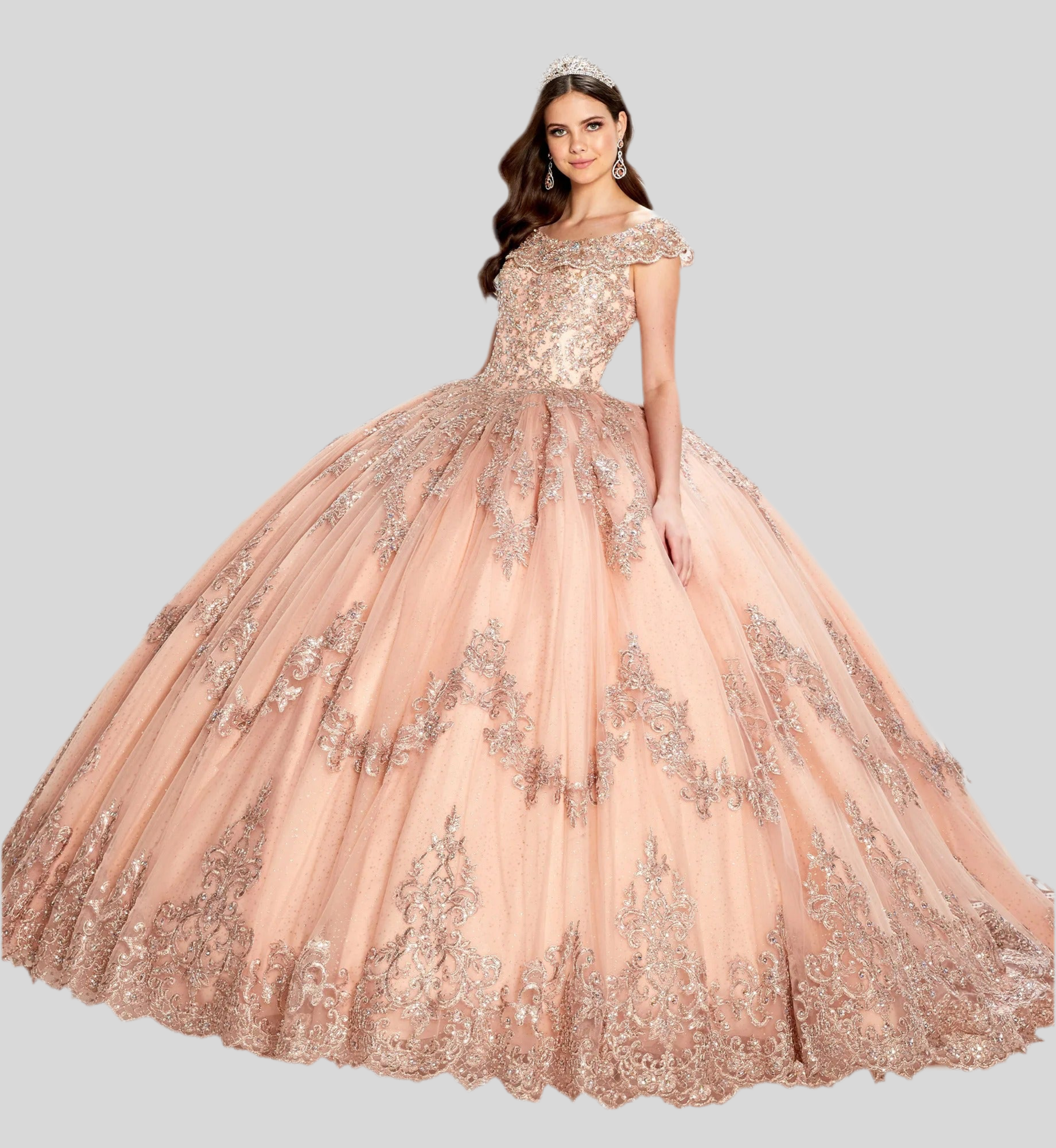 Elegant Charm: This stunning ball gown features delicate cap sleeves and a luxurious tulle skirt that exudes elegance. Adorned with intricate appliques and shimmering beads, this dress is perfect for making a grand entrance at any quinceañera or sweet 16 celebration.