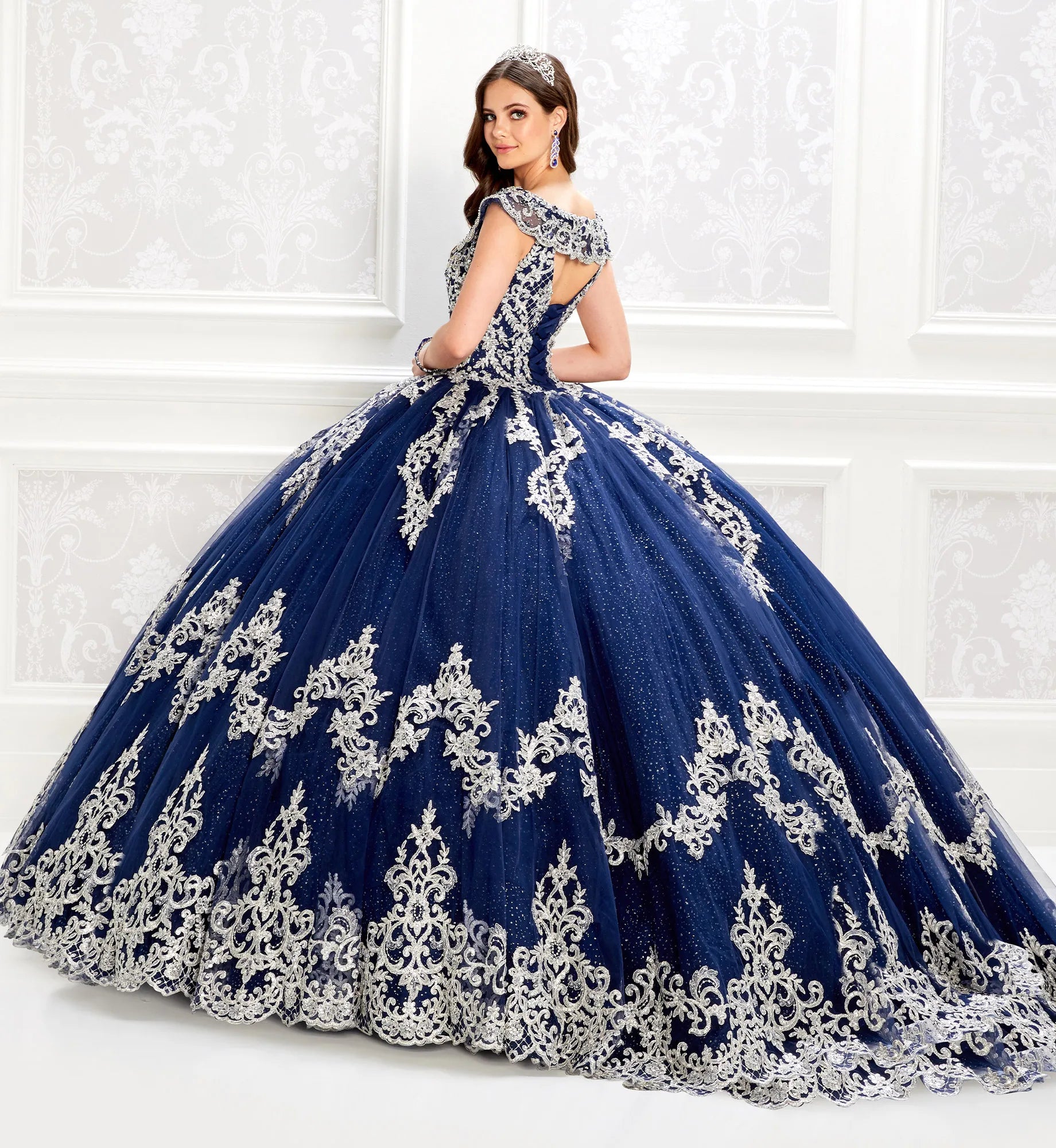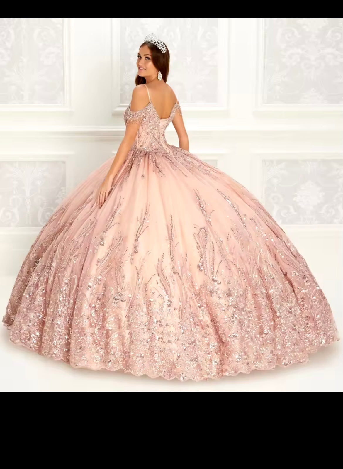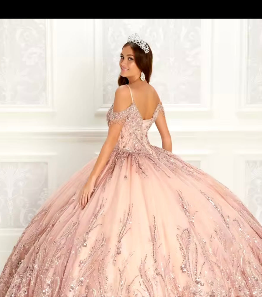 Elegant Charm: This stunning ball gown features delicate cap sleeves and a luxurious tulle skirt that exudes elegance. Adorned with intricate appliques and shimmering beads, this dress is perfect for making a grand entrance at any quinceañera or sweet 16 celebration.