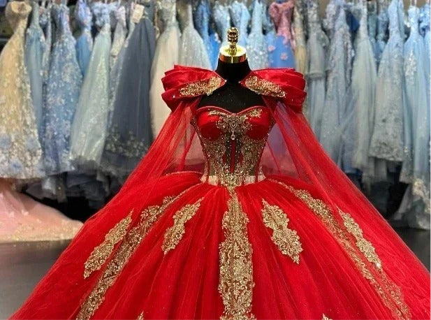 Elegant Red Ball Gown: Step into your special day with this stunning red ball gown. Designed for quinceañeras and sweet 16 celebrations, it features a beautiful silhouette that flatters every figure. The exquisite cape adds a touch of drama, ensuring all eyes are on you.