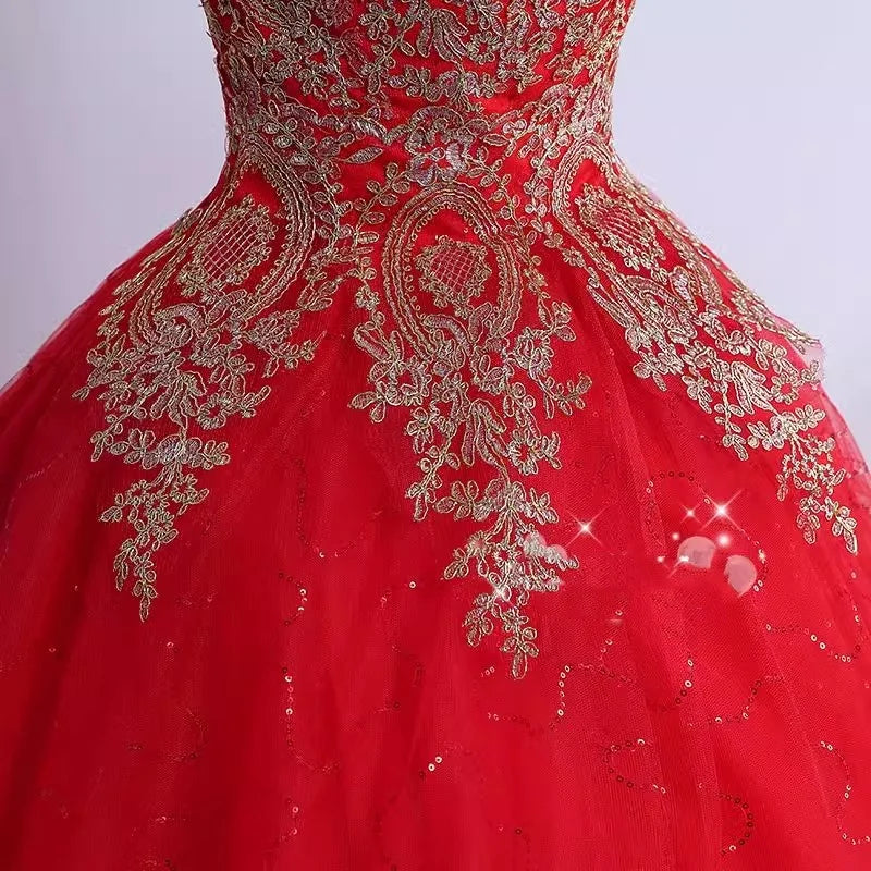 Elegant Red Tulle Wedding Dress: Experience romance in this stunning red tulle gown. Featuring delicate appliques and a strapless design, this floor-length dress exudes elegance. The lace-up back ensures a perfect fit, while the trailing skirt adds a touch of drama for your special day.