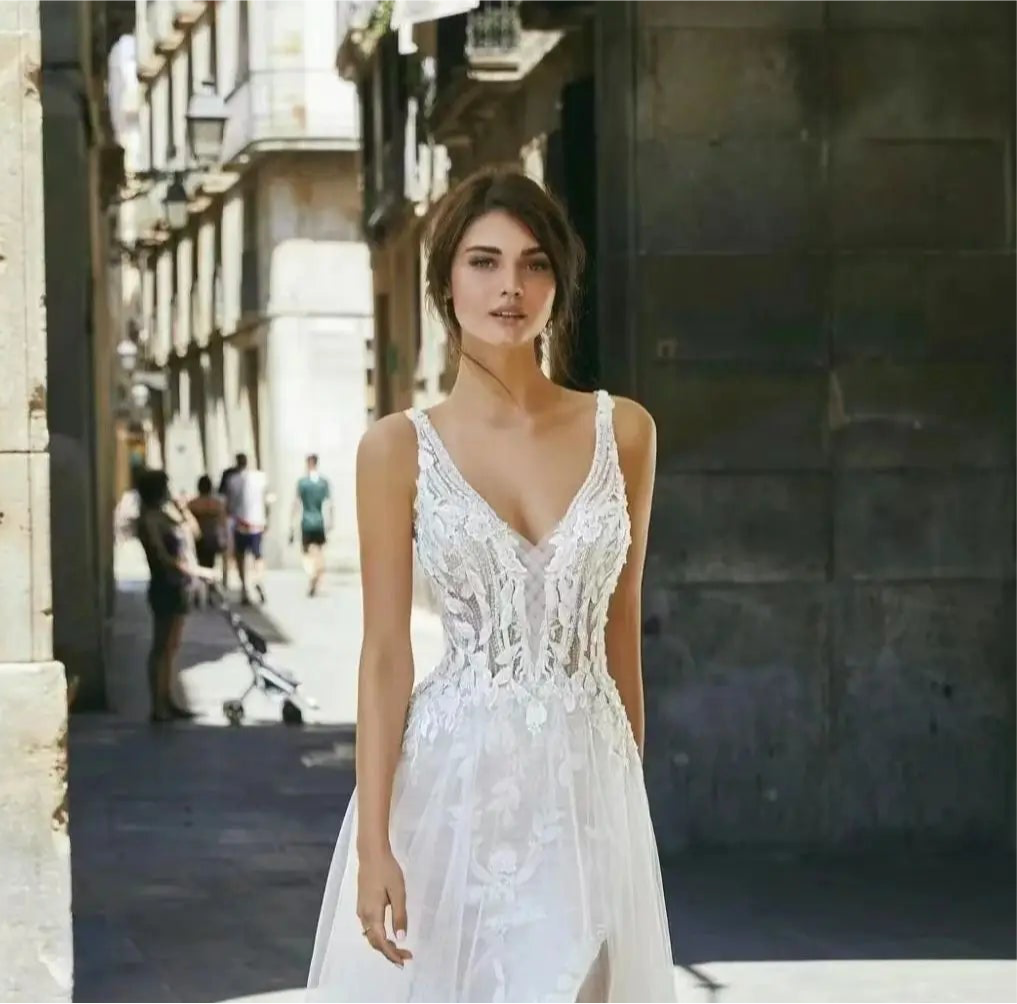 The dress boasts a flattering V-neckline that beautifully complements your décolletage, while the delicate spaghetti straps add a touch of ethereal charm. The A-line silhouette gently skims your curves, creating a universally flattering shape that flatters every figure. The dress flows seamlessly into a sweep/brush train, adding a touch of drama and elegance as you walk down the aisle.