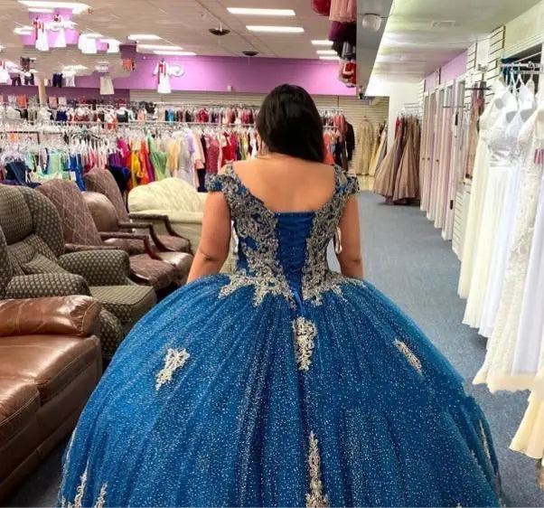 Sparkling Elegance: Elevate your special day with our Shiny Glitter Blue Quinceañera dress. This stunning gown features a captivating glitter finish that catches the light beautifully, making you the center of attention at any celebration. The cold shoulder design adds a modern touch, while the puffy ball gown silhouette creates a fairy-tale look. Perfect for Sweet 16 parties, this dress combines elegance and style, ensuring you feel like a princess.