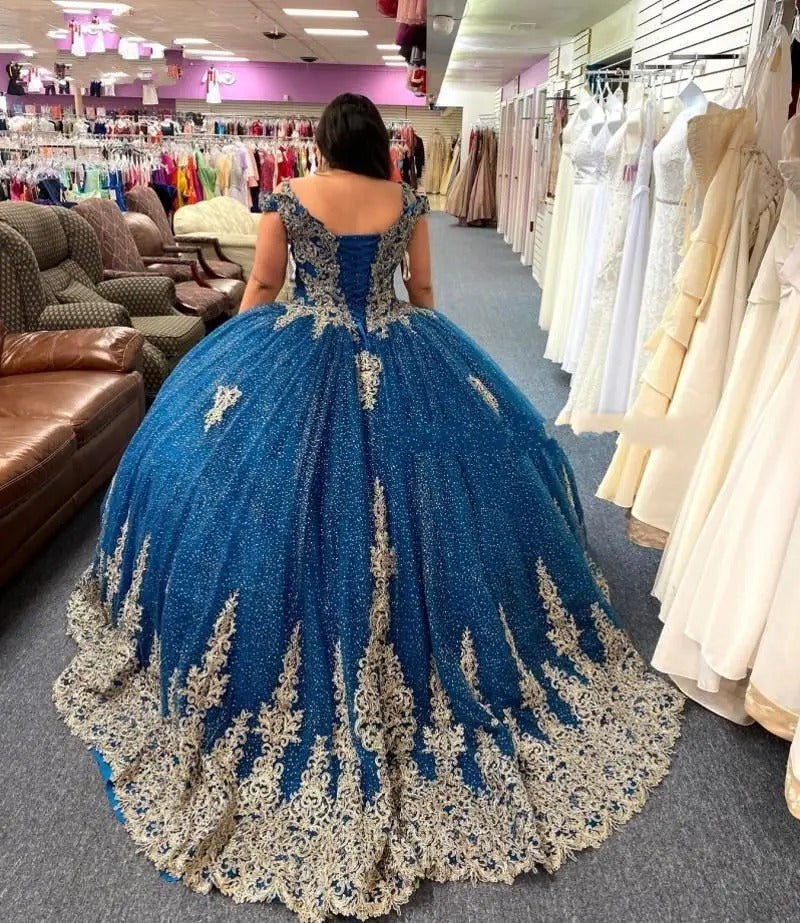 Modern Fairytale: Step into a modern fairytale with our Shiny Glitter Blue Quinceañera dress. The eye-catching glitter and cold shoulder design give this ball gown a chic and contemporary vibe. Whether you’re celebrating your Sweet 16 or attending a prom, this puffy gown will ensure you stand out. Let your personality shine through in this stunning and unique dress.
