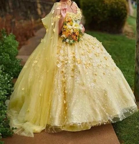 This exquisite lace applique floor-length gown with cape is more than just a dress, it's a symbol of your transformation into a graceful young woman.