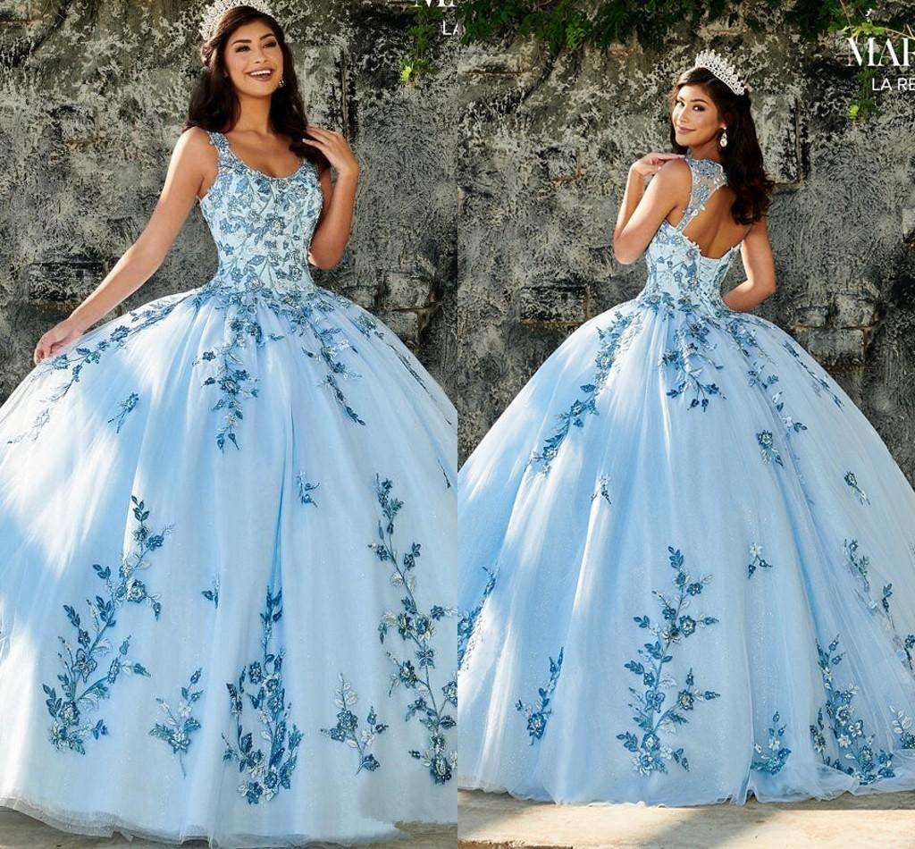 Timeless Charm: Elevate your quinceañera with this exquisite sky blue dress. The classic ball gown shape and charming scoop neck offer a timeless appeal, while the sparkling appliques add a touch of glamour. A perfect choice for a memorable celebration!