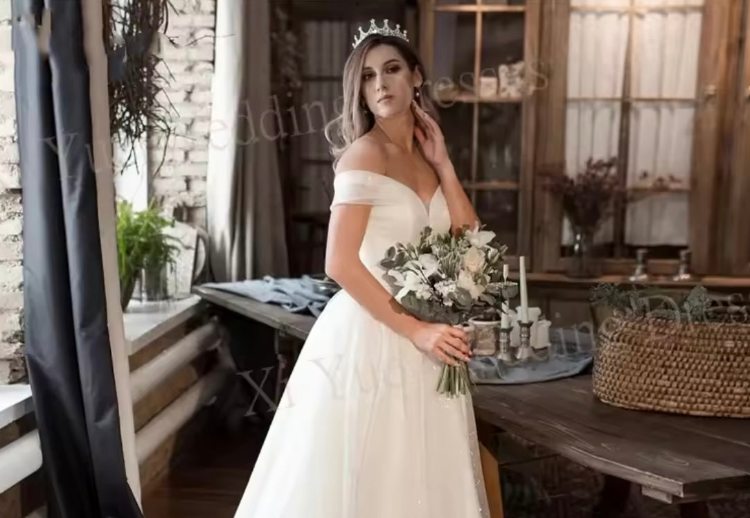 The "Graceful Off-the-Shoulder A-Line Wedding Dress" is more than just a dress; it's a statement of timeless elegance and enduring love. It's the perfect choice for the bride who wants to celebrate her special day with confidence, grace, and a touch of vintage romance.