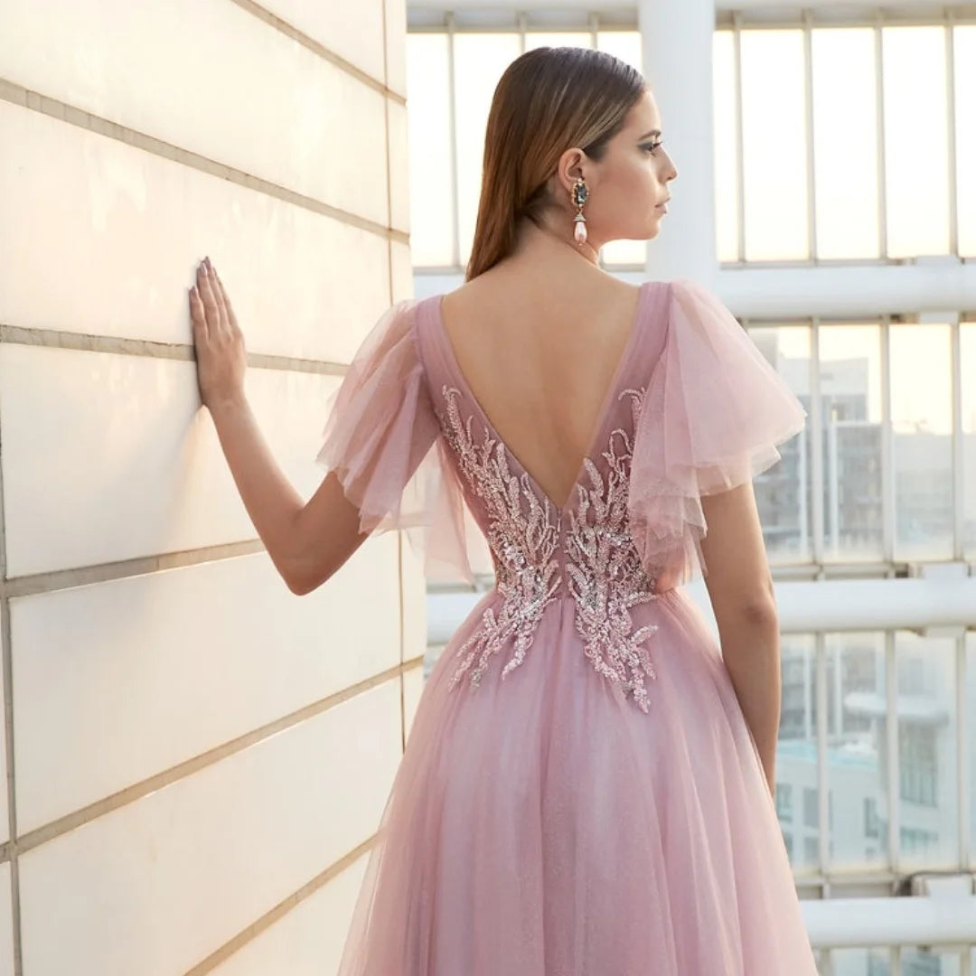 Dramatic Prom Dress: Unleash your inner diva in this striking double V-neck prom dress. Crafted from airy tulle, it showcases an A-line silhouette with short pagoda sleeves and an eye-catching backless design. Adorned with sequins and appliqués, this gown promises to turn heads at any event, making it a must-have!