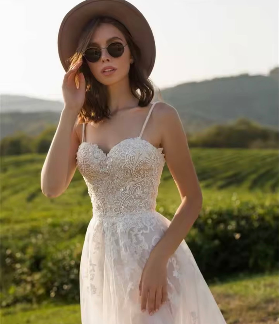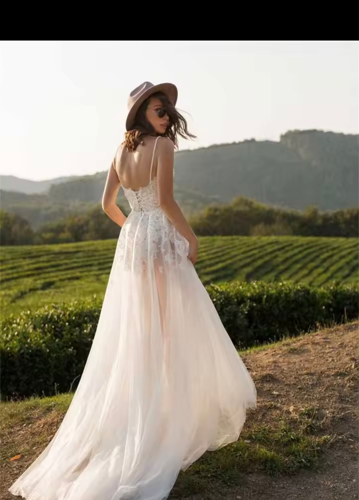 Crafted from delicate tulle, this dress embodies a touch of pastoral charm, perfect for the bride seeking a whimsical and carefree feel on her special day. The silhouette flatters with a natural waistline that seamlessly flows into a flattering A-line skirt, skimming the floor with a sweep/brush train.