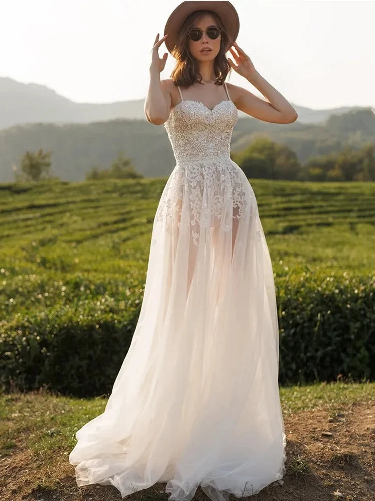 Delicate spaghetti straps frame the shoulders, drawing the eye to the stunning sweetheart neckline, a universally flattering cut that highlights your décolletage. Intricate lace appliques adorn the bodice, adding a touch of vintage allure and a hint of romantic texture.
